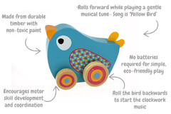 Bring gentle music and movement into playtime with the Koala Dream Bird Wind n Walk Music Box. Designed to charm and delight, this adorable wooden bird rolls gracefully across the floor while playing the sweet melody of Yellow Bird. Simply pull the bird back on its wheels, release, and watch as it glides forward, filling the room with soft, soothing music. Made from smooth, durable timber and painted with child-safe, non-toxic colours, this enchanting music box combines traditional craftsmanship with playful design. It encourages fine and gross motor skills as children learn to grasp, pull back, and follow the moving bird. With no batteries required, the Wind n Walk Bird offers a calm, eco-friendly play experience that parents will love and little ones will treasure. Perfect as a gift or keepsake, this timeless toy adds a touch of wonder to any nursery or playroom.
