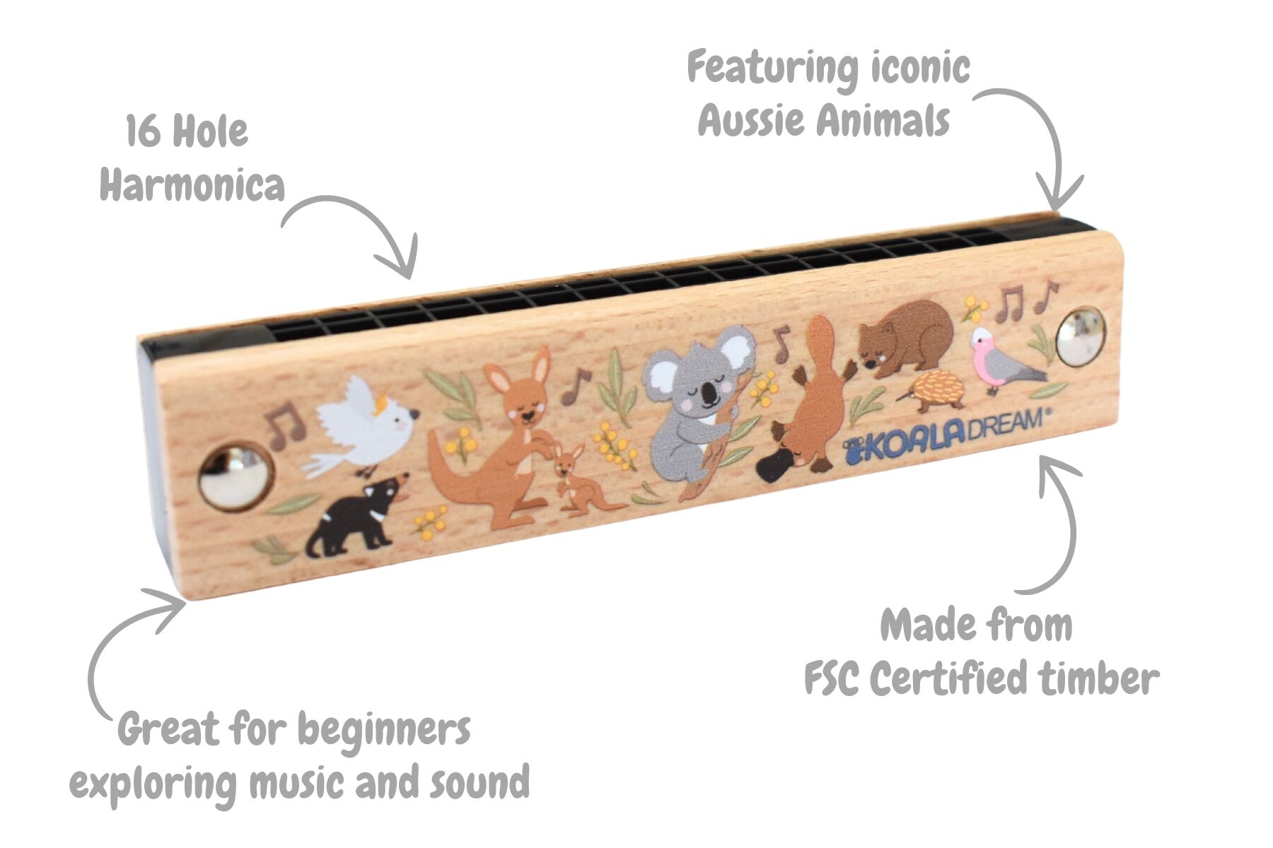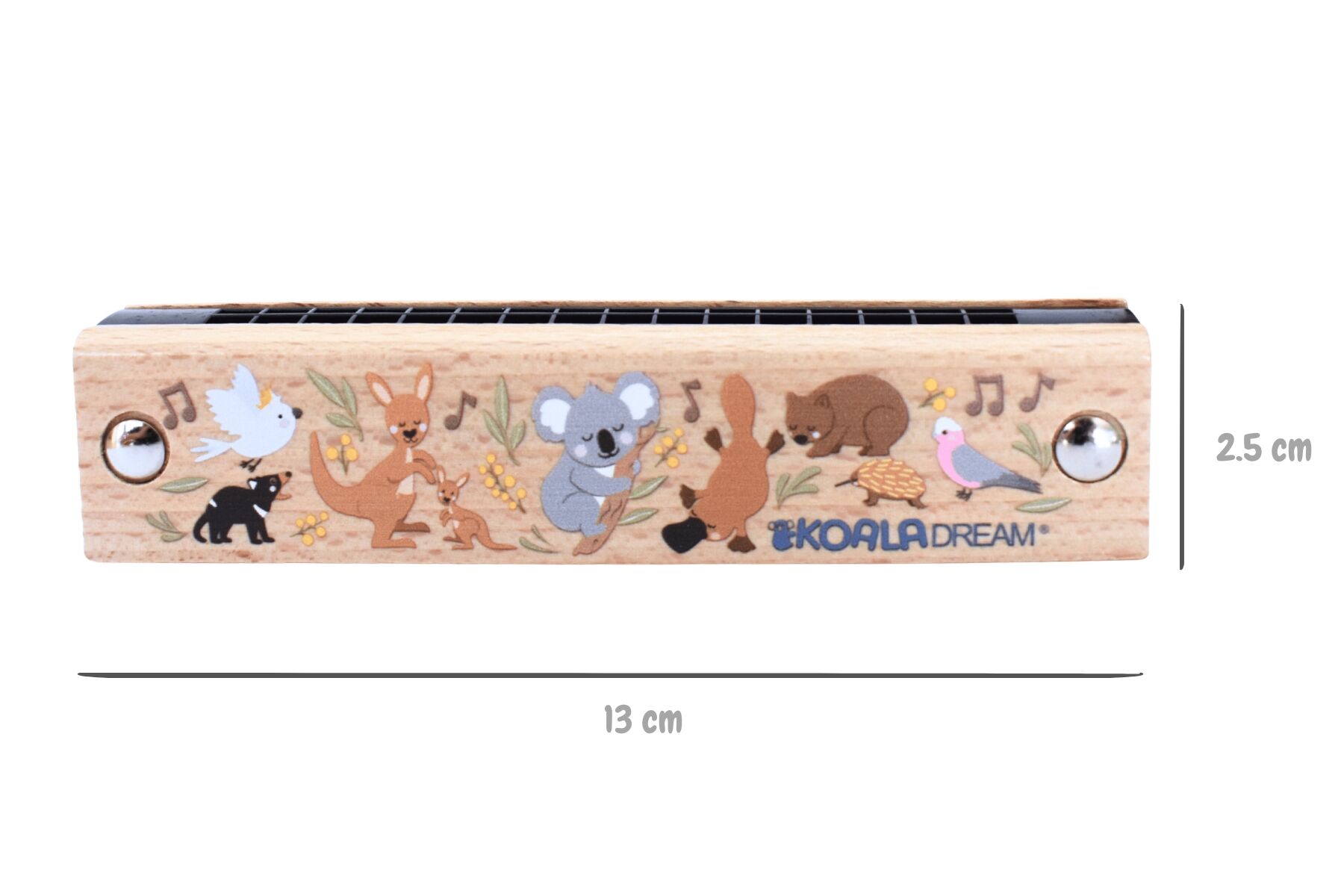 Make music fun and meaningful with the Koala Dream Bush Buddies Aussie Animals Wooden Harmonica. Designed to inspire early musical exploration, this charming instrument features colourful illustrations of Australian native animals including a koala, platypus, wombat, kangaroo and joey, along with other bush friends.