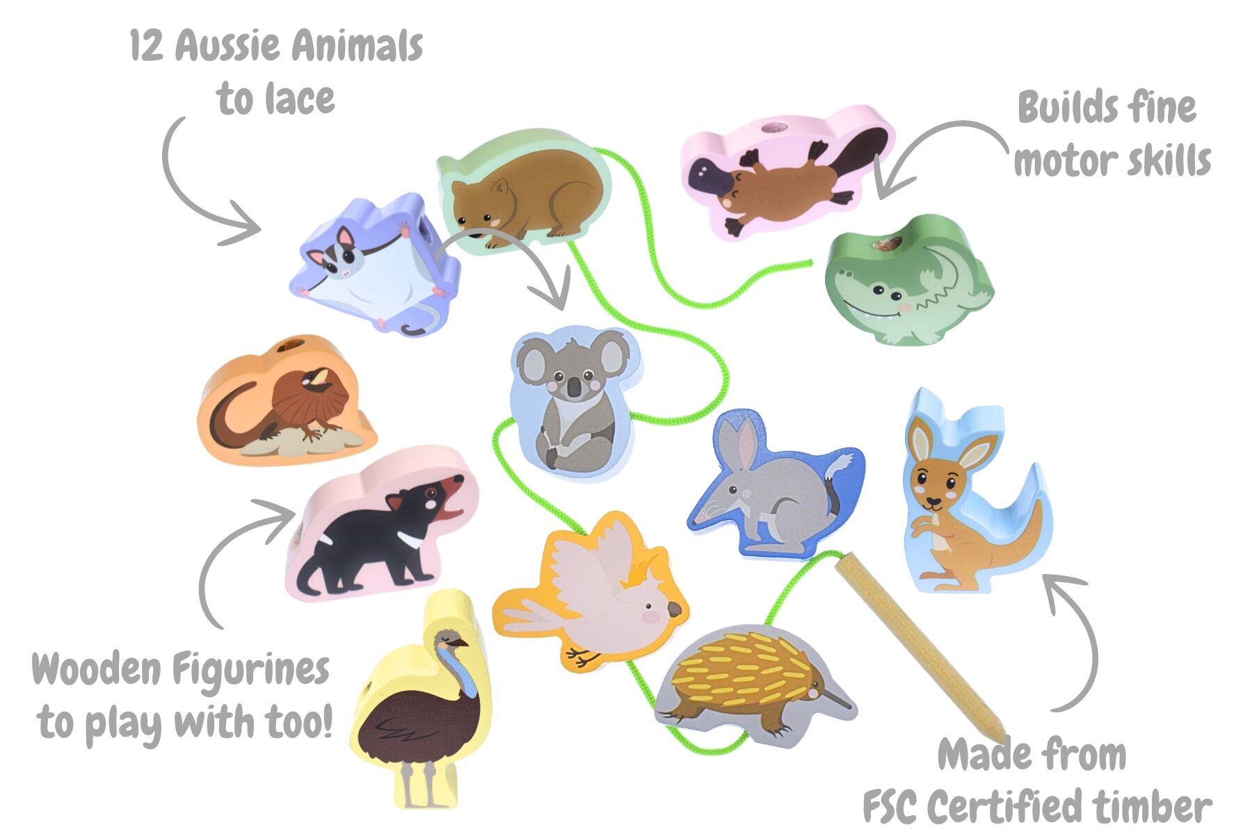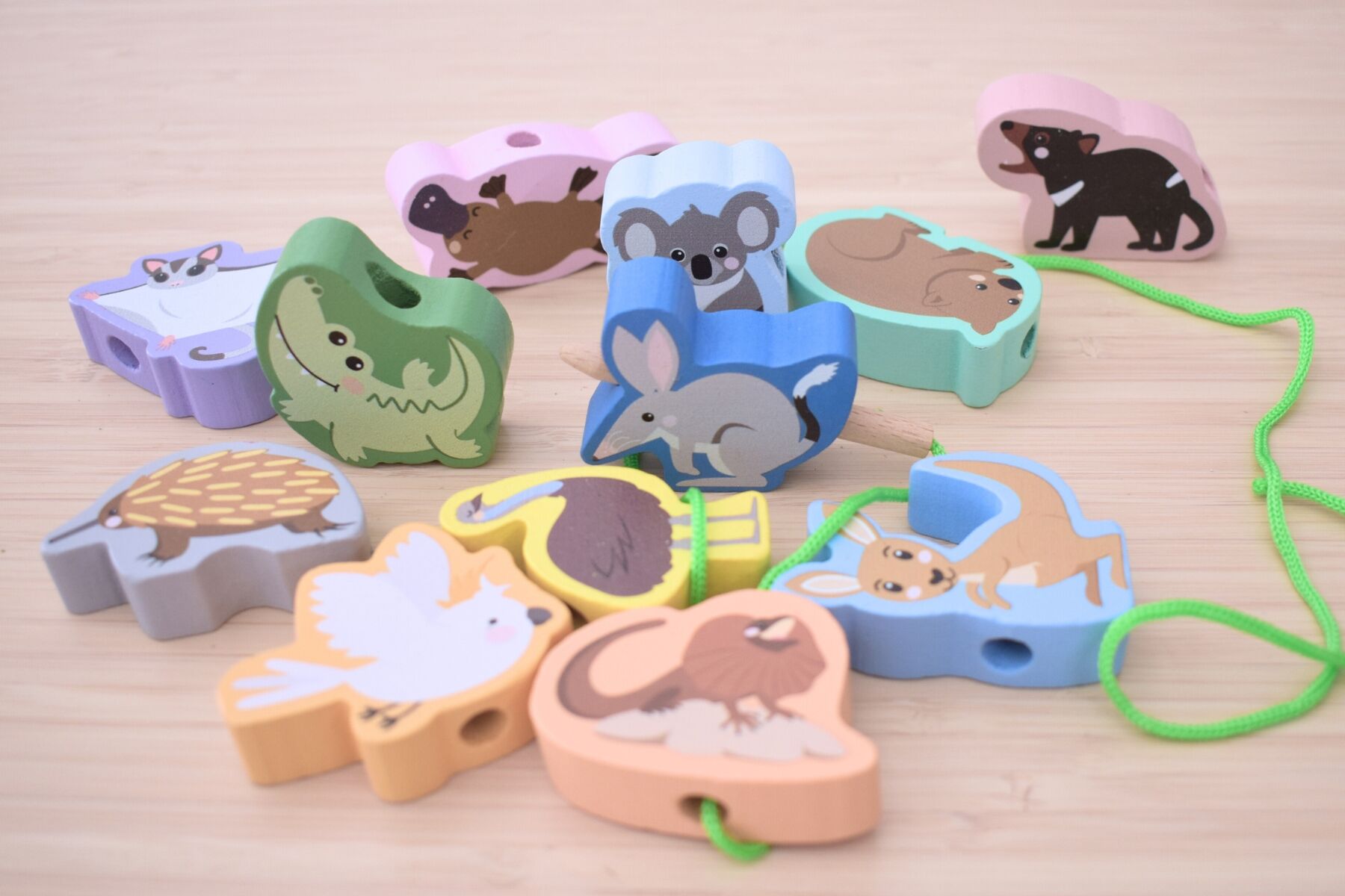 Encourage fine motor skills and hand eye coordination with the Bush Buddies Threading Aussie Animals from Koala Dream. This beautifully designed set features a collection of 12 adorable Australian animals including a kangaroo, koala, wombat, platypus, echidna and more. Each wooden animal has holes on either side, allowing children to thread the lace through and explore creative play while improving concentration and dexterity.