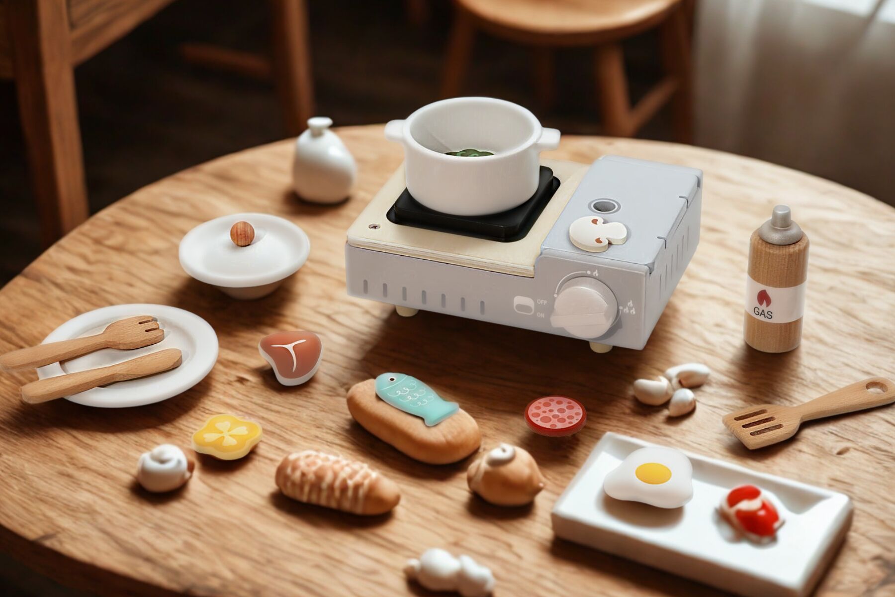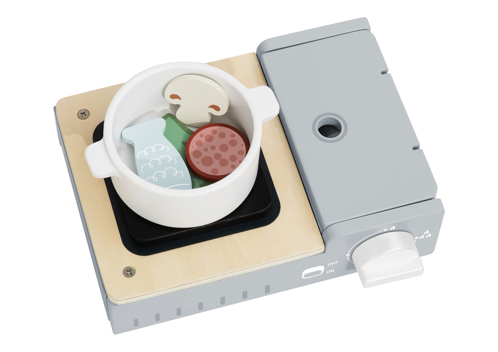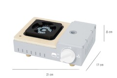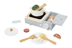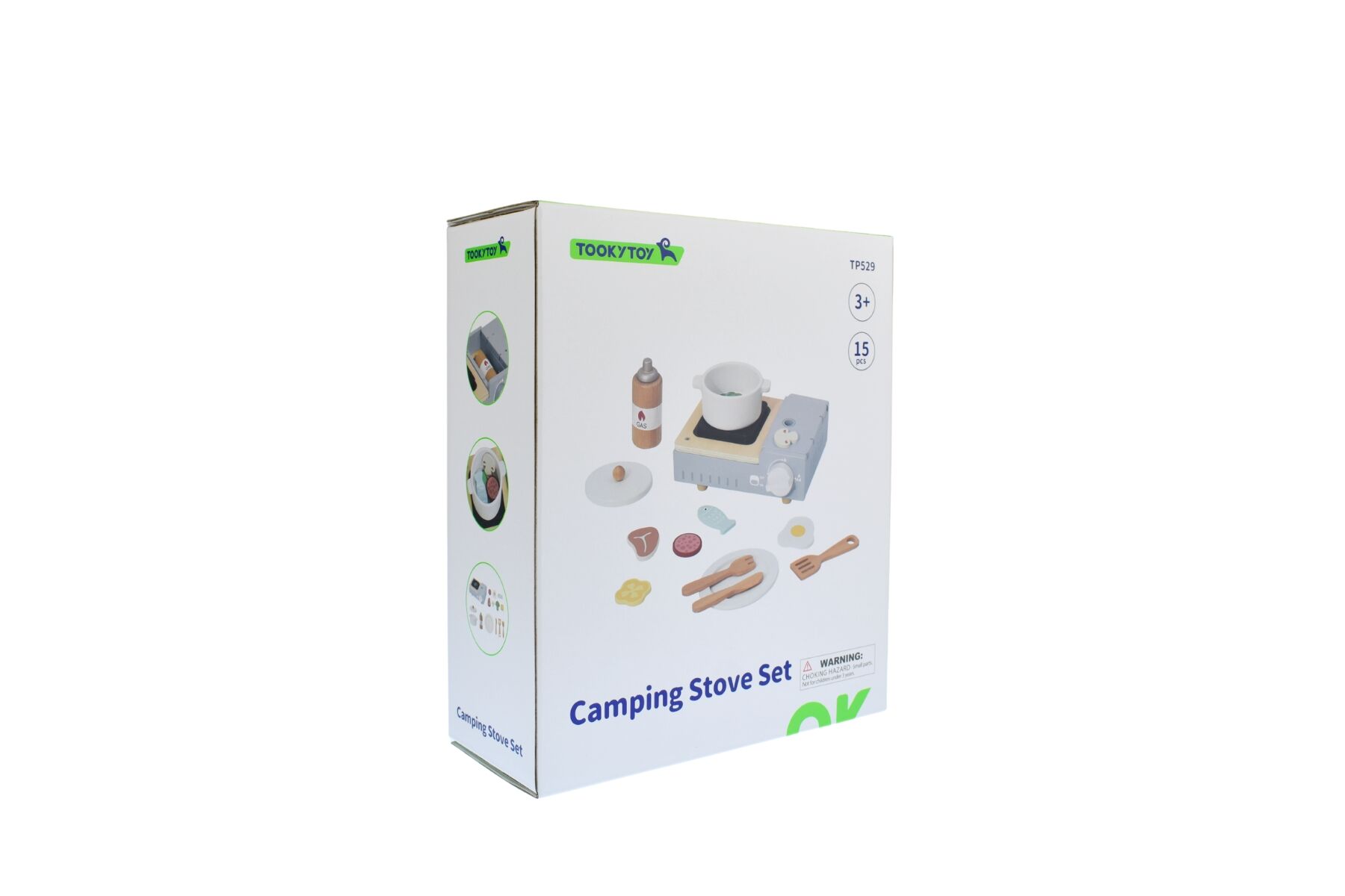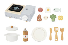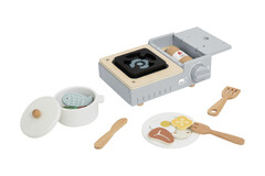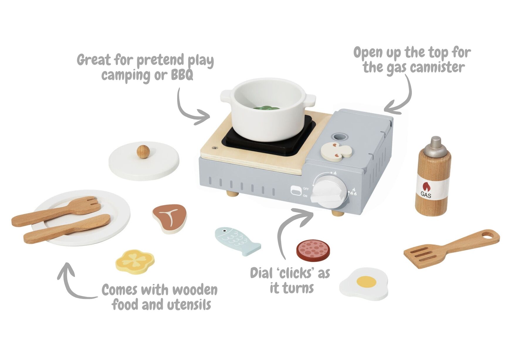 Bring outdoor adventure into imaginative play with the Camping Stove Set, a beautifully crafted wooden playset designed to mimic a real camp cooking experience. Little explorers can “fire up” the stove using the turnable knob and attach the wooden gas canister for extra-realistic role play. The compact stove design makes it perfect for cooking pretend meals anywhere, from the play kitchen to a make-believe campsite. This complete set includes a sturdy wooden stove, pot with lid, plate, utensils, and a selection of wooden food pieces such as fish, egg, steak, mushroom, broccoli, pepper, and a slice of salami. Each piece is crafted from FSC-certified timber with smooth edges and non-toxic finishes, ensuring safe, eco-friendly fun for little hands. Ideal for developing creativity, fine motor skills, and social pretend play, the Camping Stove Set encourages children to chop, stir, cook, and serve imaginative meals. Its durable and portable design makes it easy to take on adventures, indoors or outdoors, offering endless opportunities for hands-on learning and storytelling.