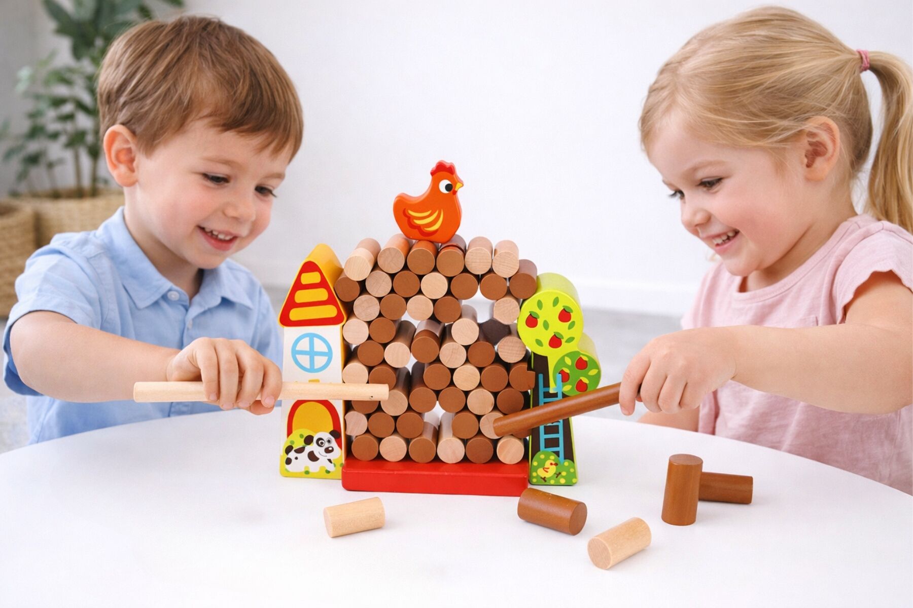 The wooden farm-themed block game is a fun and interactive game for both children and adults. This game is easy to learn, but hard to master. Taking turns, one at a time, players must try and remove their coloured rods (light or dark rods) from the frame without letting the chicken fall off. Long rods are given to each player to help them push the rods off the pile, but be careful, it might fall! The first person to remove all of their coloured rods without disturbing the chicken wins! This game is best played with 2 players, but can be played in teams of 2 for more players. The goal of balancing the chicken on top of the stacked rods can also provide a fun challenge for players, helping them develop their hand-eye coordination and fine motor skills. Additionally, playing games like Jenga can help promote social skills such as turn-taking, cooperation, and communication. Each wooden from Tooky Toy is made from timber and finished to the highest quality and painted in child safe, non toxic paint.