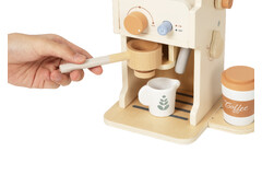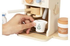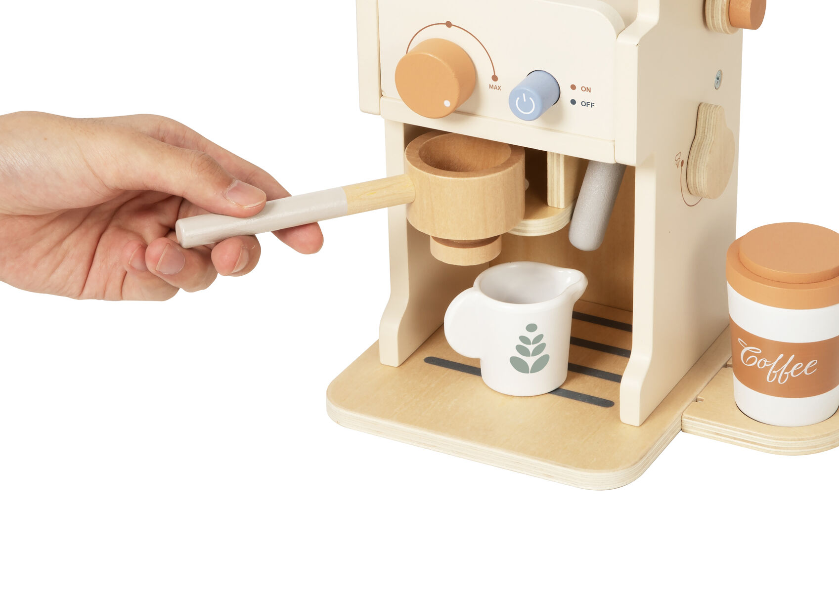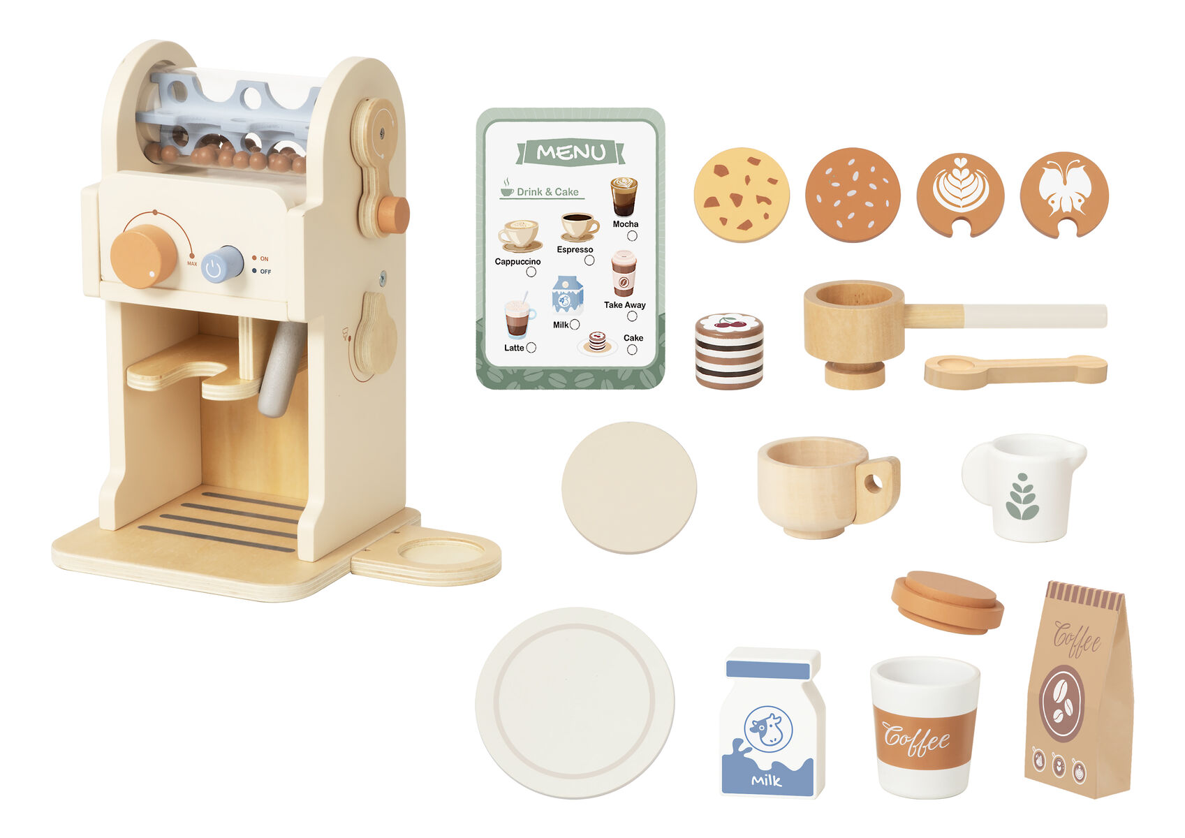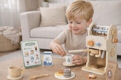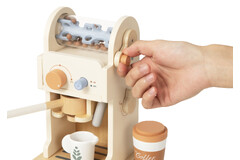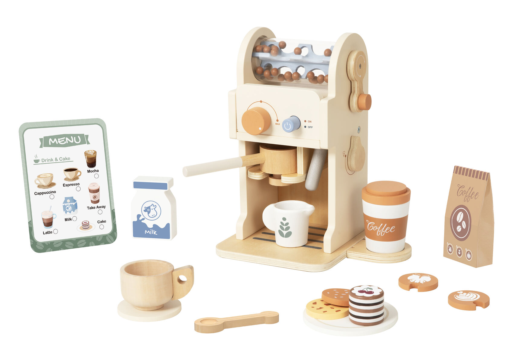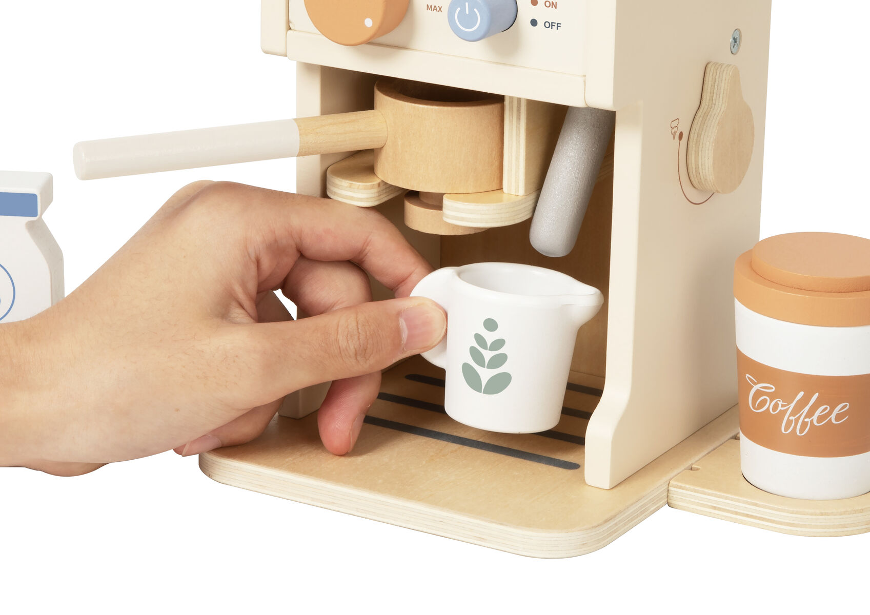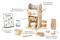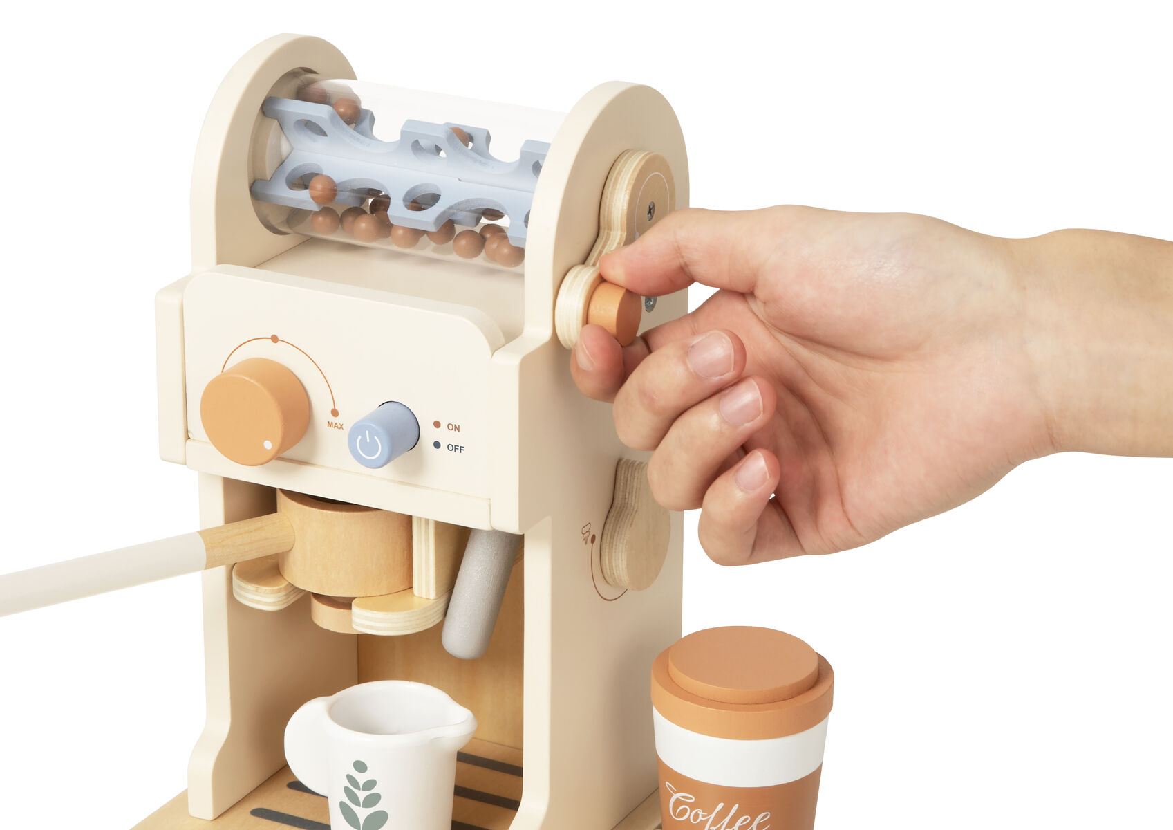 Create a mini cafe at home with this Wooden Coffee Machine Playset. Little baristas will love grinding the beans watch the beads tumble, turning the knobs, and serving up pretend coffees just like the grown-ups. With a menu card, cups, milk, coffee pack and sweet treats to display and share, children can take orders, practise polite social play and build confidence through imaginative role play.