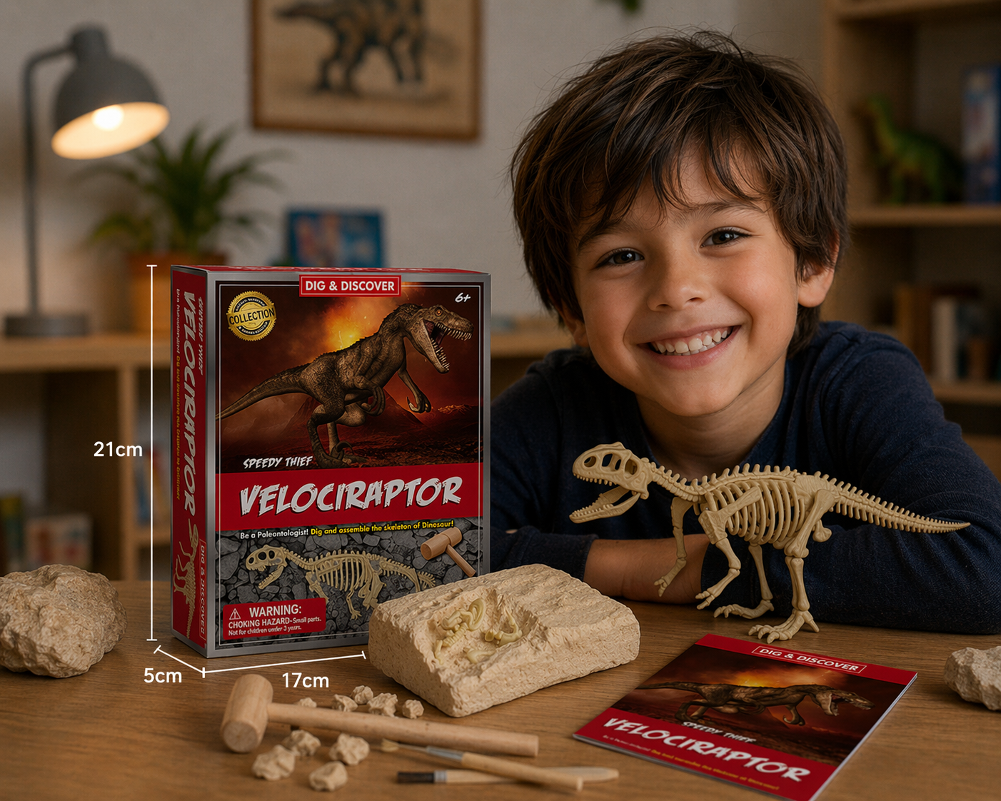 The Dig a Dinosaur Skeleton Kit from Kaper Kidz is an exciting and educational activity for any young palaeontologist or dinosaur enthusiast. The kit comes complete with everything needed to excavate a Velociraptor skeleton from a plaster block, including a wooden chisel, brush, and hammer. As children carefully chisel away at the plaster, they will develop skills such as patience and problem-solving while learning about the anatomy of a Velociraptor . Once the skeleton has been fully excavated, children can assemble it on the included display stand to create a stunning piece of prehistoric decor for their room. This kit provides a fun and engaging way for children to learn about dinosaurs and palaeontology, while also developing their fine motor skills and creativity. It is a perfect gift for birthdays or holidays, and will provide hours of educational entertainment for young minds.