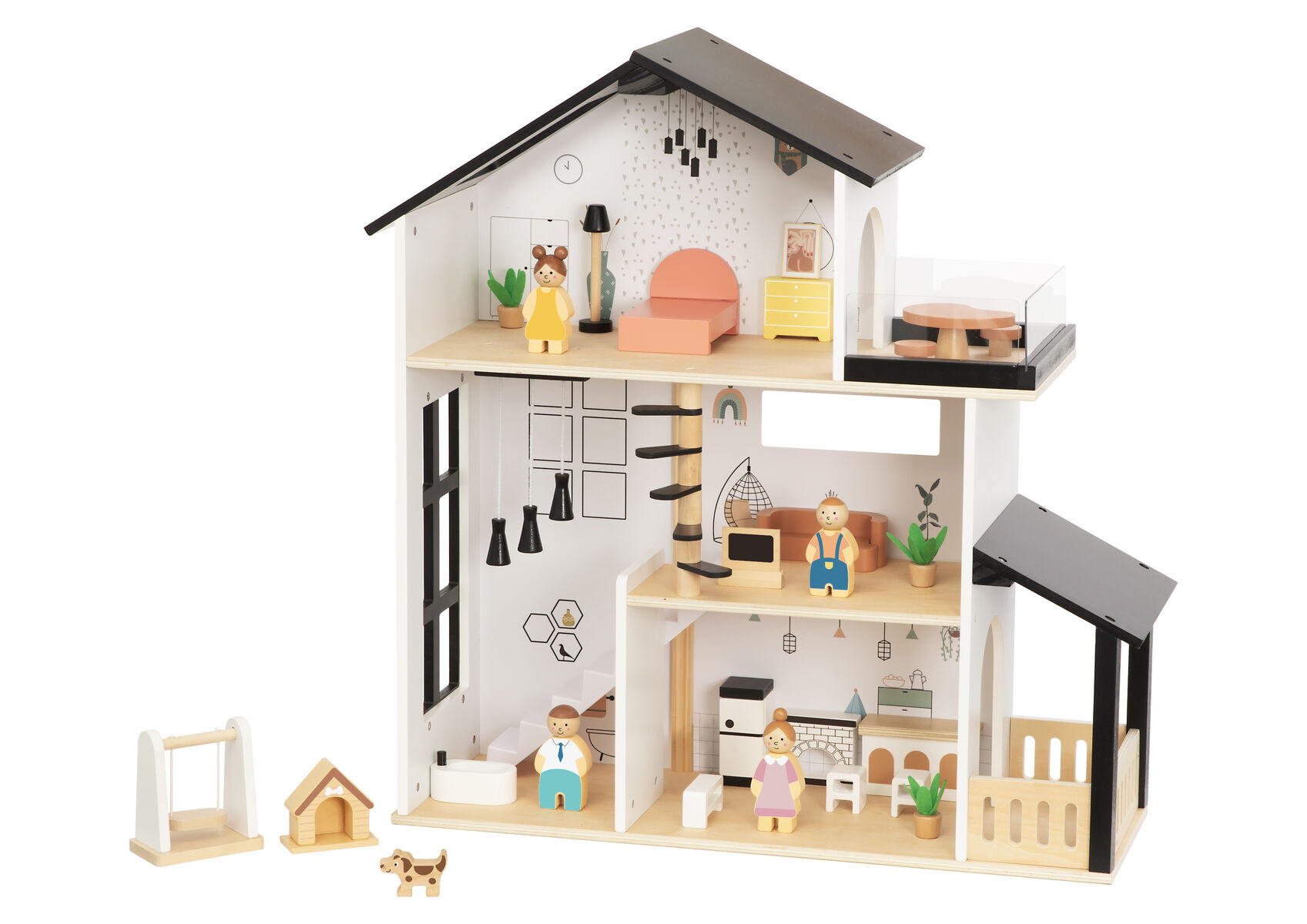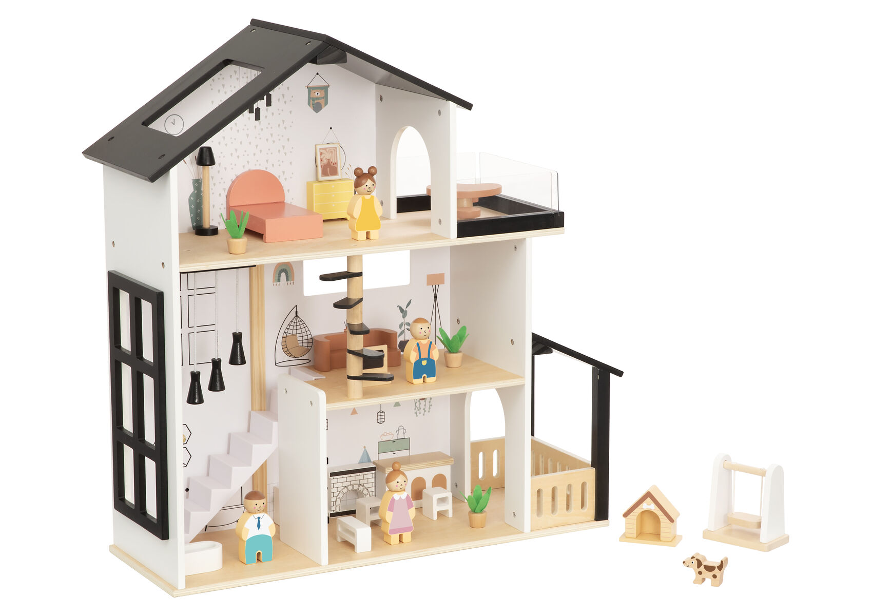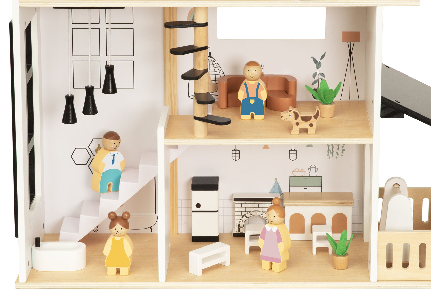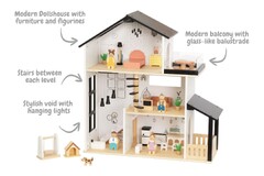 Create a whole world of stories with this modern wooden dollhouse. The open front design makes it easy for little hands to play together from every side. With three levels and multiple rooms children can act out daily routines bedtime breakfast playtime and family adventures while building confidence and communication through role play.