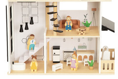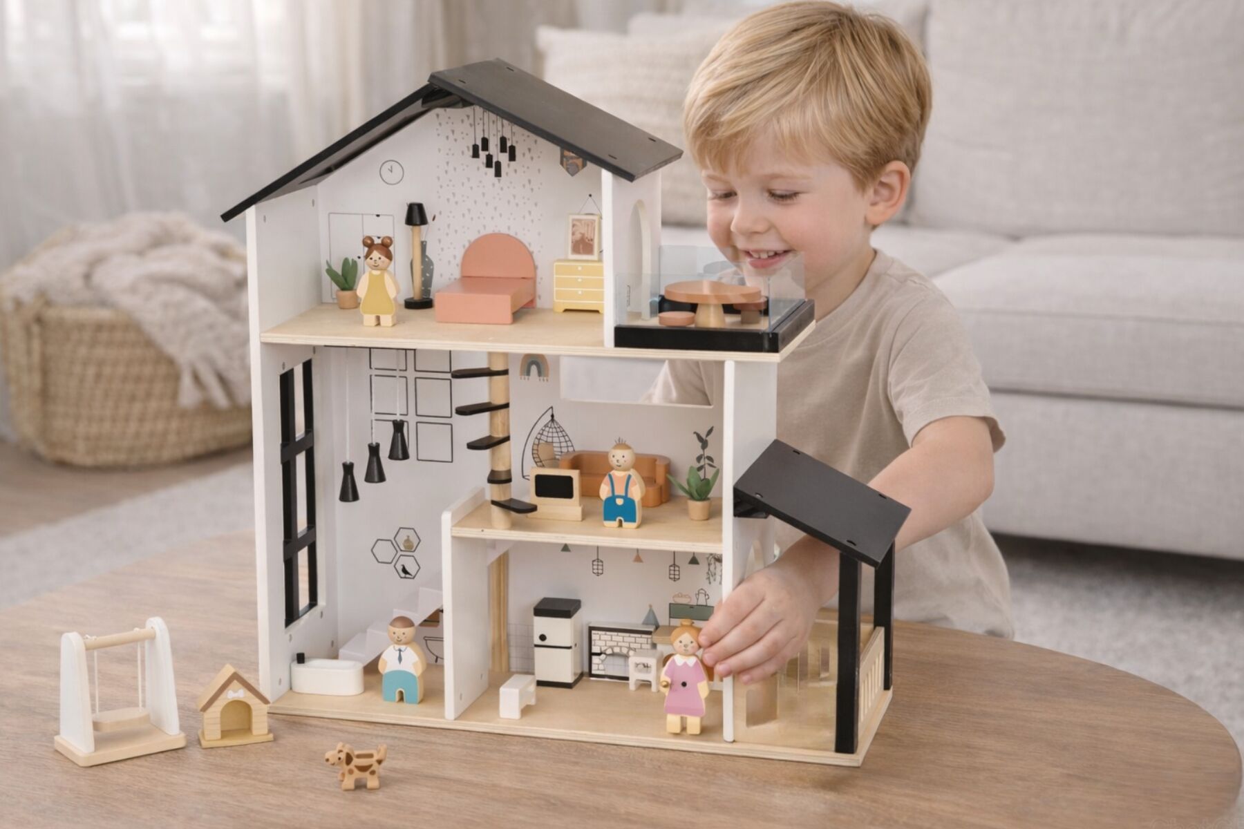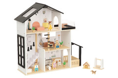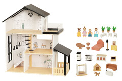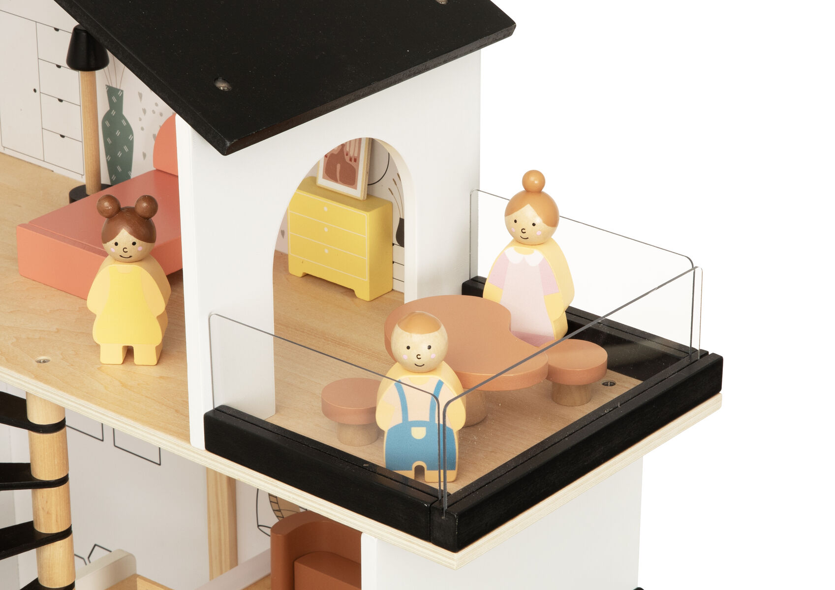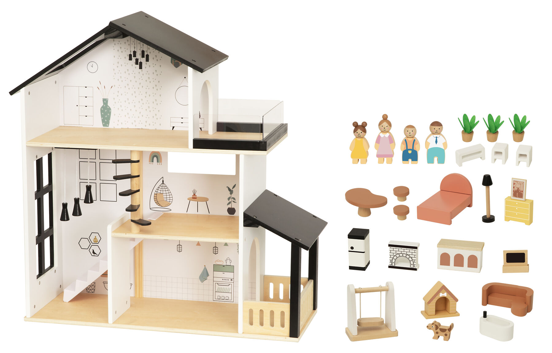 Create a whole world of stories with this modern wooden dollhouse. The open front design makes it easy for little hands to play together from every side. With three levels and multiple rooms children can act out daily routines bedtime breakfast playtime and family adventures while building confidence and communication through role play.