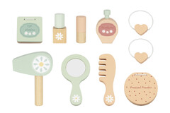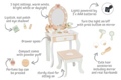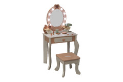 The Dressing Table from Tooky Toy is a beautifully crafted wooden vanity set in a soft dusty pink and white finish, perfect for inspiring imaginative play. It features a large oval touch-activated mirror that lights up with three colour settings—warm white, bright white, and sunlight—creating a magical, realistic experience for little ones as they get ready for pretend outings. The mirror requires 3 × AAA batteries (not supplied). Children can sit comfortably on the matching stool and enjoy hours of styling and role play. The vanity comes with a delightful range of wooden accessories, including lipstick, perfume, eye shadow, pressed powder, hair dryer, comb, mirror, and hair accessories. Each piece is made from FSC-certified timber and finished with non-toxic, child-safe paints for safe and durable play. Assembly is simple and child-friendly: the set is easy to screw together and includes a screwdriver and spare screws, making setup quick and convenient. Designed to encourage creativity, fine motor skills, and social interaction, this charming dressing table offers a special space for children to explore self-expression through pretend play. Perfect for bedrooms, playrooms, and little stylists who love make-believe moments.