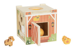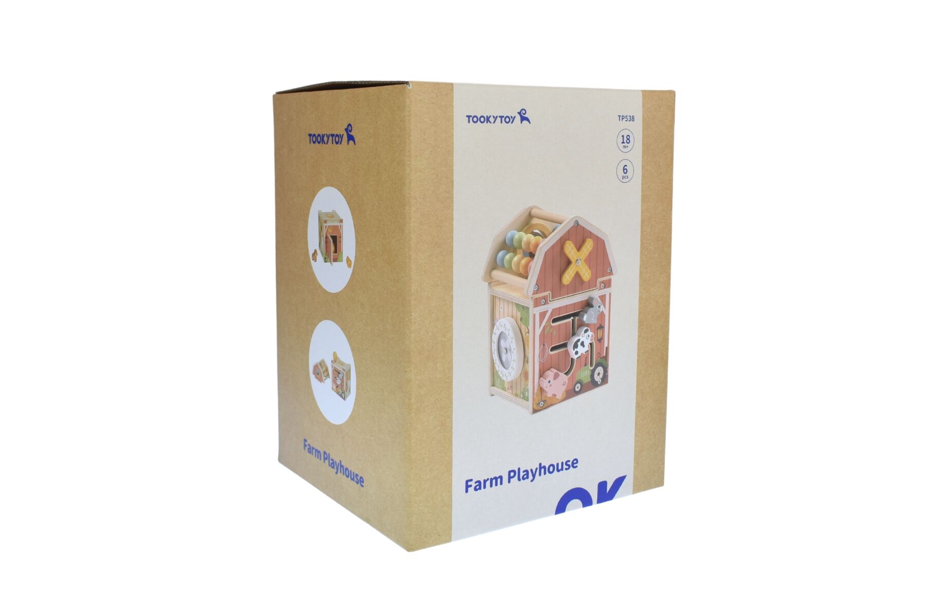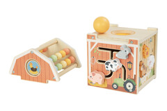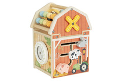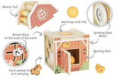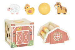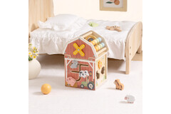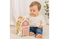 Bring farmyard fun to playtime with this interactive Wooden Farm Play House — a multi-activity barn packed with engaging features on every side. The barn separates into two main play sections, revealing even more to explore. On the roof, little ones can enjoy an abacus-style bead counter, a spinning wind vane, and a turning rooster for added sensory play. The sturdy base of the barn doubles as a shape sorter, complete with a soft felt ball entry for pushing the included ball through. A handy barn door allows easy access to all the pieces once playtime is done. Another side features a charming turning bead carousel that encourages fine motor skills and visual tracking. Children can match shapes, spin elements, slide pieces, and experiment with early counting while exploring friendly farm animals like the cow, sheep, pig, chicken, rabbit, and horse. These colourful characters naturally support storytelling, animal recognition, and imaginative play. Crafted from FSC-certified timber with smooth edges and non-toxic paints, this durable activity barn is safe for little hands and built for lasting fun. With plenty of action on every surface, it’s the perfect educational toy for toddlers who love animals, movement, and discovery-based play.