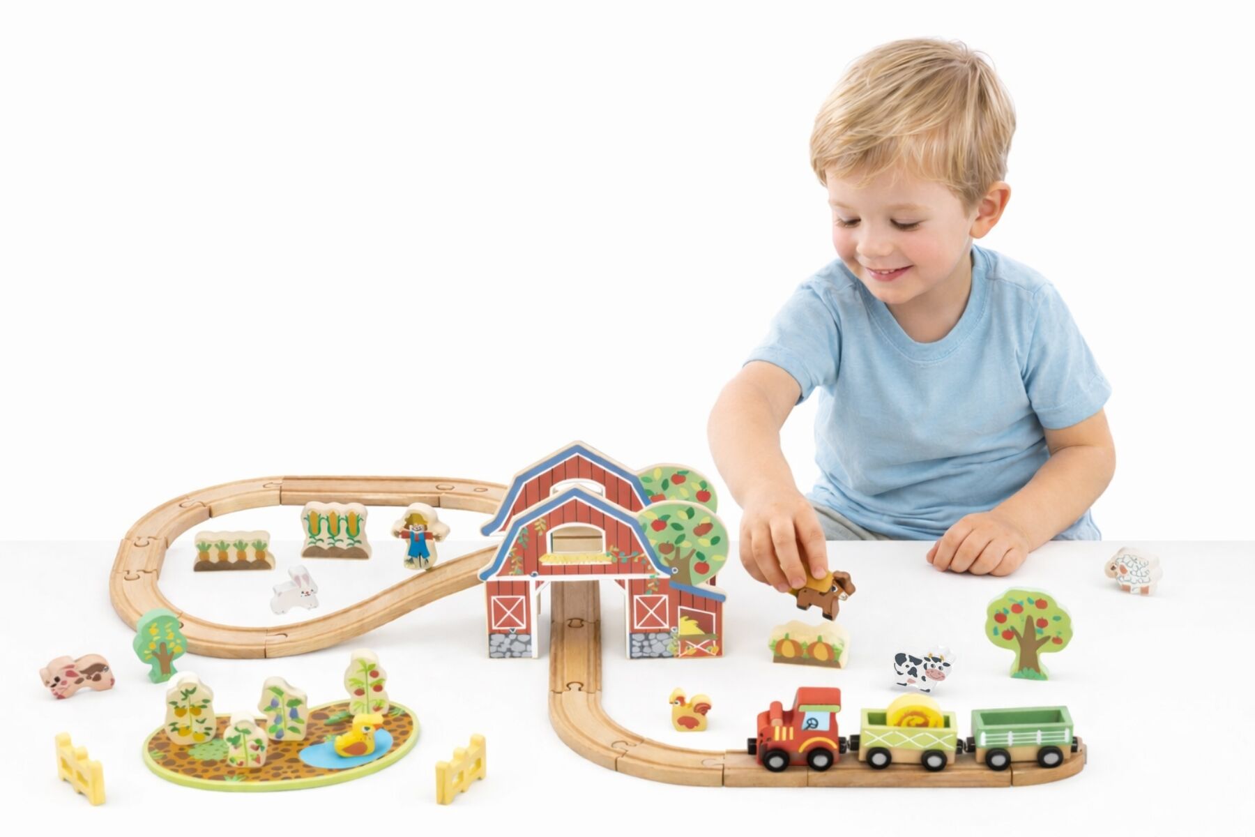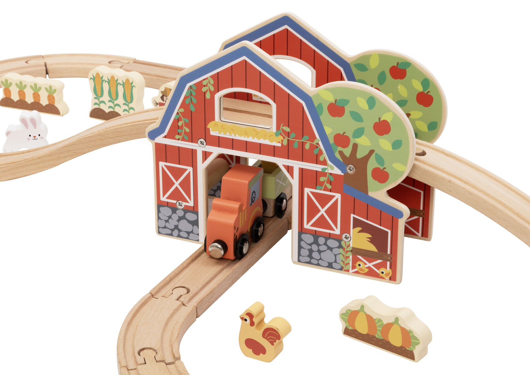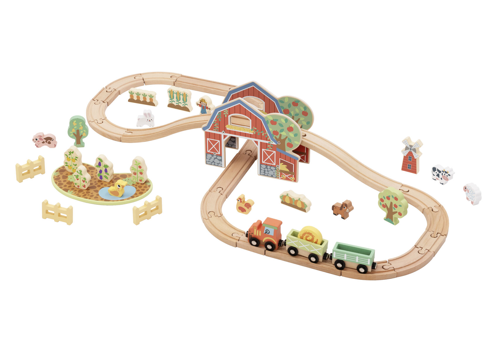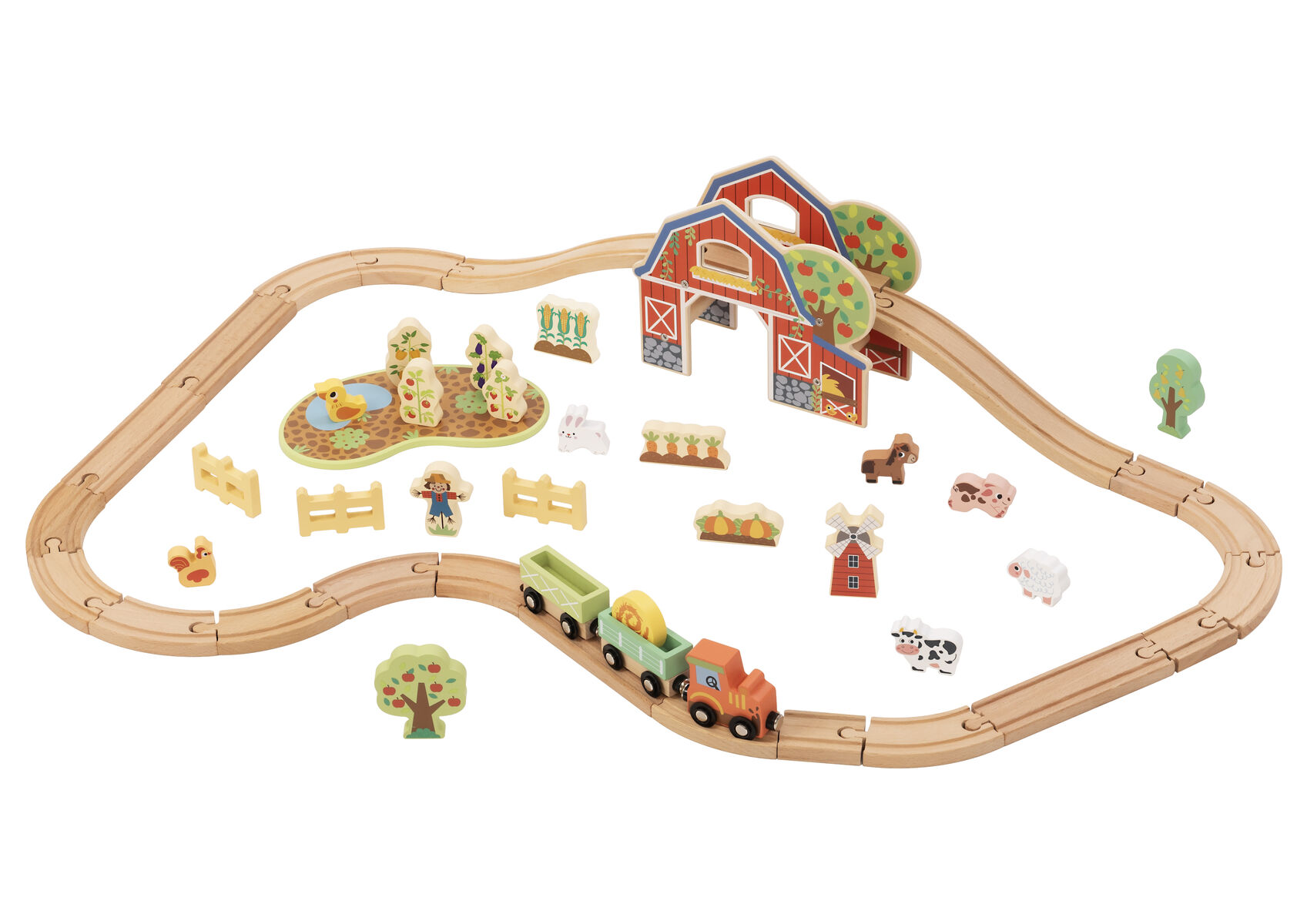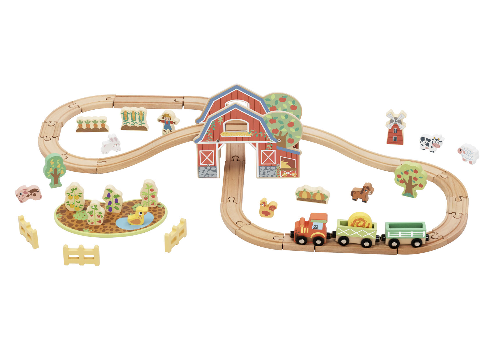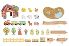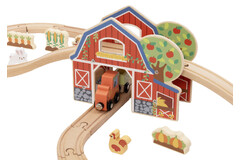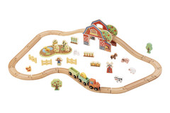 Bring the countryside to life with this wooden farm train set. Children can build the track create a fun ramp section and drive the train through the barn and around the farm. With animals crops trees fences and farm characters kids can invent endless stories from feeding animals to delivering harvest cargo and visiting the windmill.