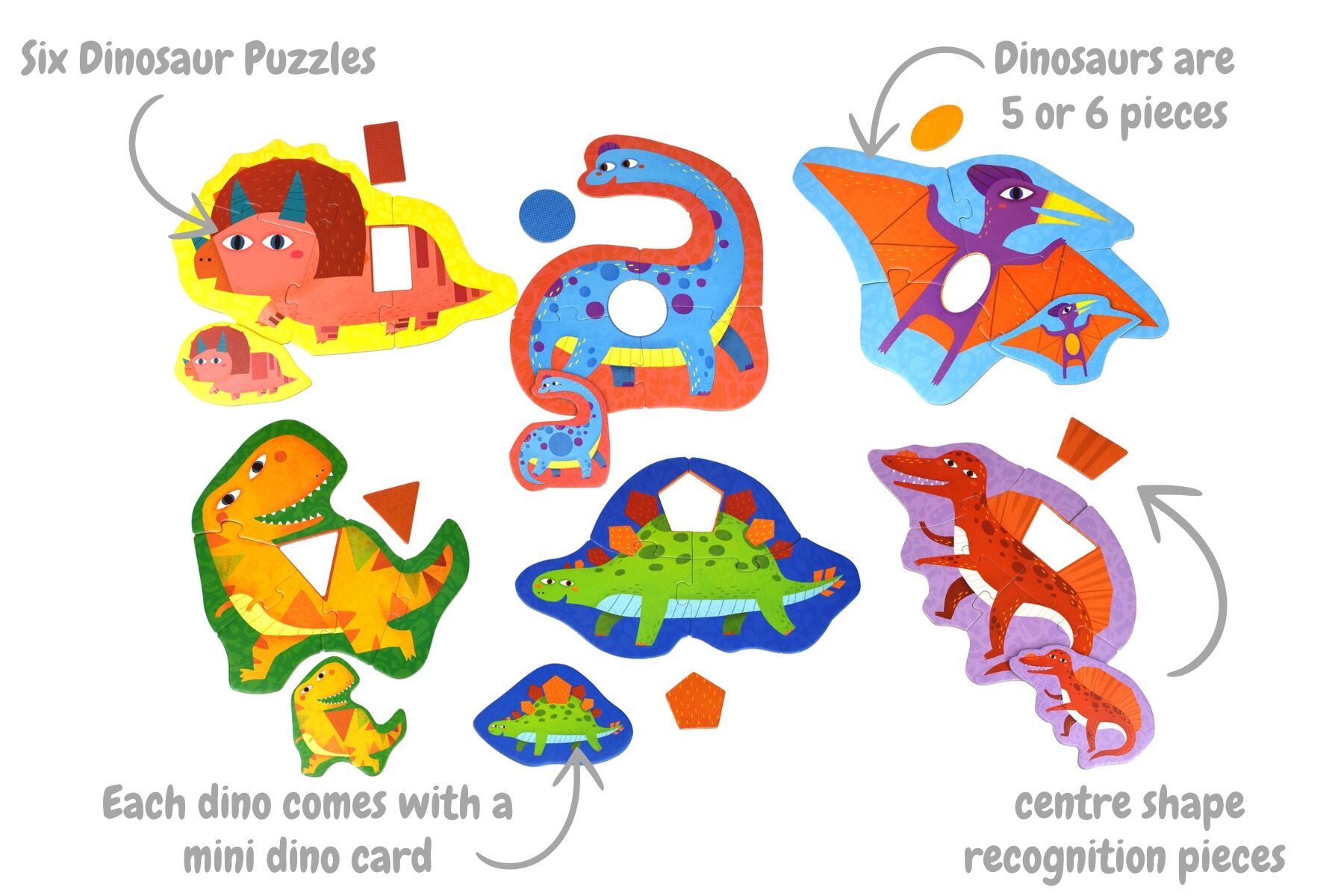 Introduce young learners to the fun of puzzle-building with the Jar Melo First Puzzle – Dinosaur Jigsaw Puzzle set. Designed especially for beginners, this adorable collection includes 6 dinosaur-shaped puzzles, each made up of 5 or 6 chunky pieces that are easy for little hands to grasp and assemble. Each puzzle features a special shaped piece — including a circle, oval, triangle, pentagon, rhombus and rectangle — helping children build early shape recognition skills as they play. As a bonus, the set also comes with 6 mini dinosaur cut-outs for matching games, storytelling and imaginative play. With 33 puzzle pieces in total, this engaging starter set encourages problem-solving, fine motor development and confidence in young puzzlers. Perfect for toddlers who are just beginning their jigsaw journey, and a delightful way to introduce shapes, dinosaurs and early learning through play.