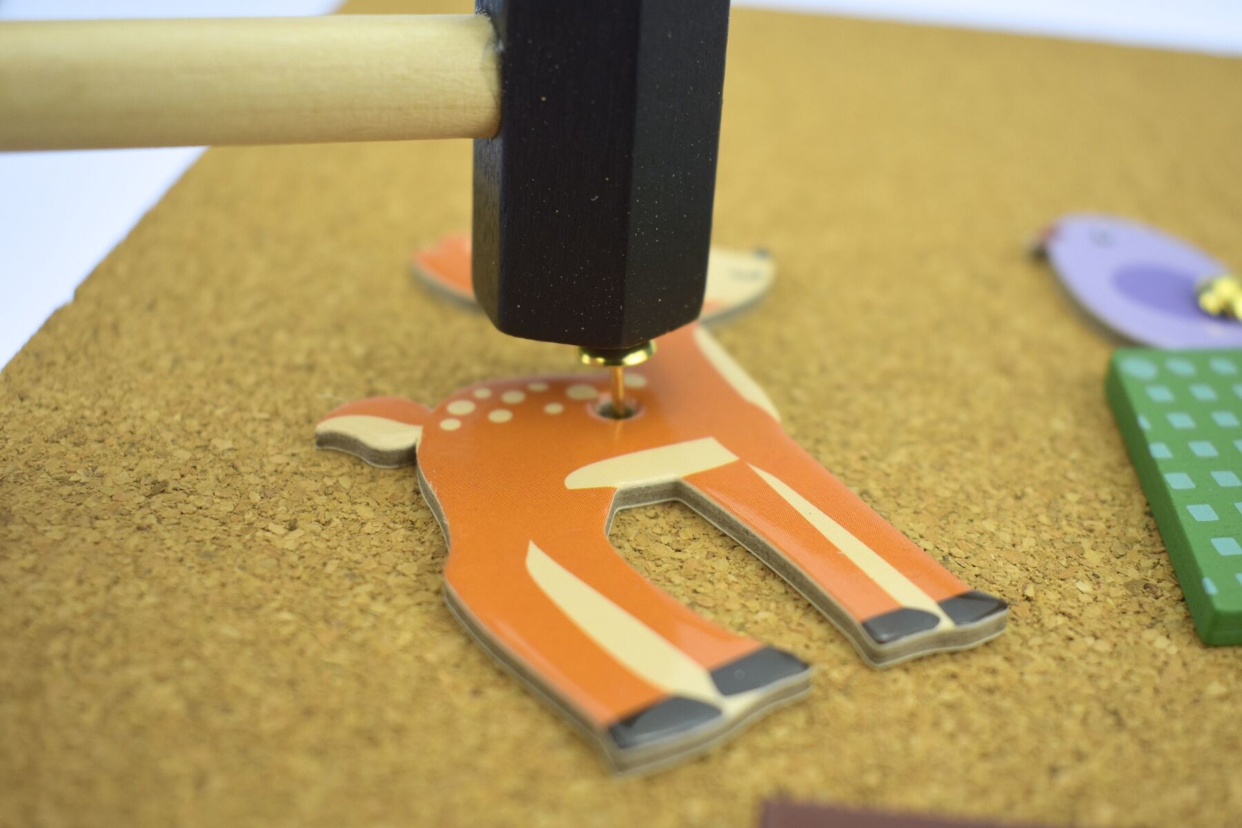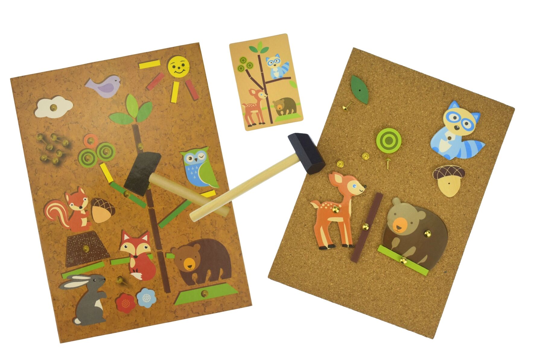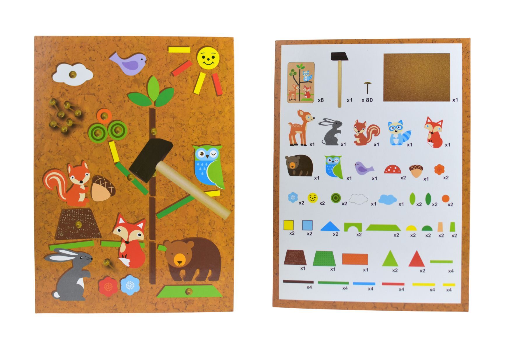 Complete with elegant and brightly coloured wooden shaped pieces and thick cardboard woodland animal pieces, this Forest Friend Tap A Shape Set from Kaper Kidz is sure to keep little ones entertained for hours. Children can construct and design their very own woodland-themed pictures by selecting the wooden tiles or charming cardboard animal pieces, then gently tapping them onto the corkboard using the included nails and wooden hammer. Each wooden tile and woodland animal piece features a small pre-made hole, making placing the nails into the corkboard easier and more enjoyable for small hands. Once the picture is complete, kids can remove the nails and pieces and start all over again—offering endless opportunities for creativity, storytelling, and imaginative play. This classic tap-a-shape activity is a fantastic way to strengthen hand–eye coordination, fine motor skills, and spatial awareness. Please note: the nails are pointy, so adult supervision is recommended and the set should be kept out of reach of younger children. Beautifully packaged in a handy book-shaped storage box with separate compartments, this set is easy to pack away and perfect for travel. Each Kaper Kidz Forest Friend Tap A Shape Set includes: 1 corkboard 1 wooden hammer 1 bag of nails 1 pack of cardboard woodland animal shapes 1 pack of assorted wooden shapes (170 pieces in total) A charming, creative, and reusable activity that will keep your little ones busy building their very own woodland wonderland again and again.