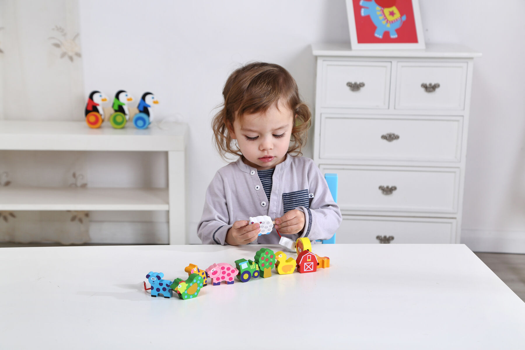 These wooden lacing farm animals from Tooky Toy will help build fine motor skills and animal recognition, which are vital for early childhood development. Your child will have fun learning to lace a thread through these cute farm animals, building hand dexterity, hand eye coordination and developing concentration and focus. Featuring cute figurines, these animals can also be played with for pretend play when not needed for lacing. Painted in bright, cheery colours, these lacing sets are a joy to learn and play with. Each wooden Lacing Farm Animal set from Tooky Toys is made from timber, finished to the highest quality and painted in child safe, non toxic paint.