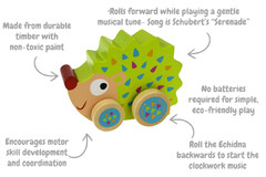 Bring joy and music to playtime with the Koala Dream Wind n Walk Echidna Music Box! Simply pull the Echidna back on its wheels, release, and watch it roll across the floor while playing the charming melody of Schubert’s Serenade. With its wind-up mechanism, no batteries are needed, making it perfect for little hands to grasp, push, and chase—encouraging both gross motor skills and interactive play. Crafted from sturdy timber and painted with child-safe, non-toxic paint, this delightful music box is designed with safety and durability in mind. Children will be enchanted as they follow the rolling Echidna around, captivated by the gentle music and whimsical movement. A charming and safe addition, the Wind n Walk Echidna makes playtime magical and engaging for toddlers and young children alike.