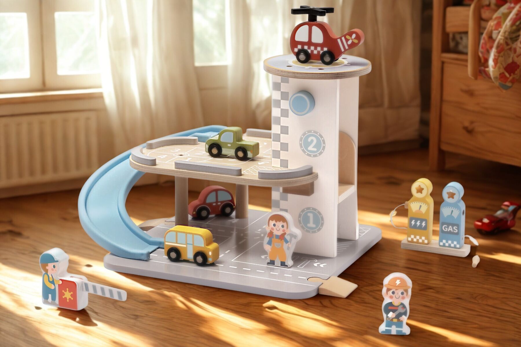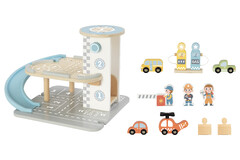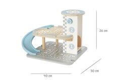 Bring big city fun to playtime with the Wooden Parking Garage from Tooky Toy. This interactive set is designed to spark endless storytelling and imaginative adventures. Children can drive their cars up the ramp, park them on different levels, refuel at the gas or electric charging stations, or even take off from the rooftop helipad with the included wooden helicopter. The set also comes with three wooden cars, three friendly worker figures, a barrier gate, and illustrated accessories to complete the scene.