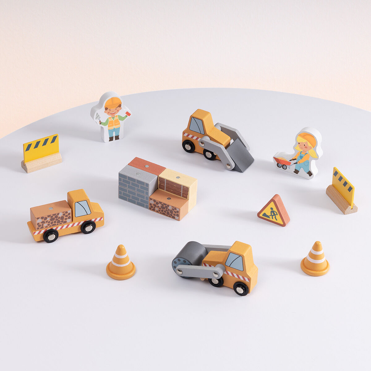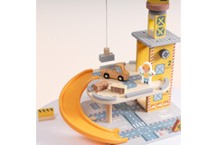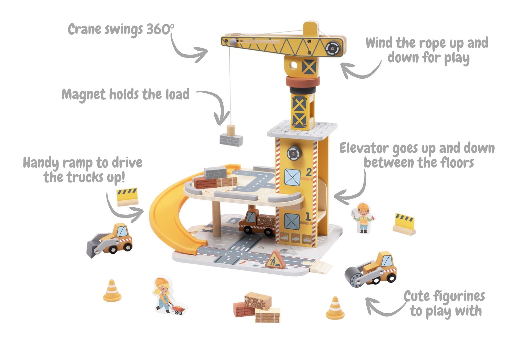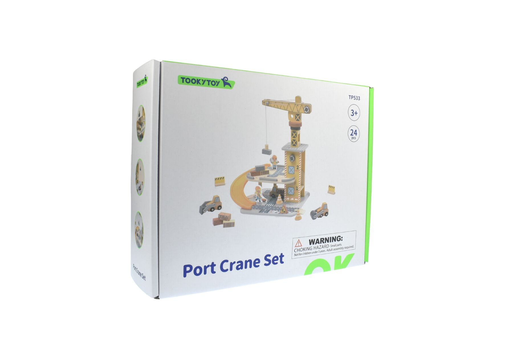 Turn playtime into a bustling construction adventure with the Port Crane Set from Tooky Toy. Children can take charge of lifting and moving blocks with the working crane, guiding the three construction trucks up the winding ramp, and coordinating the two worker figurines as they manage the busy site. Designed with two levels of play, this set includes a large functioning crane, ramp, roadways, construction vehicles, traffic cones, barriers, and building blocks to stack, lift, and transport. The two wooden worker figures bring roleplay to life, encouraging children to create teamwork scenarios and imaginative construction stories. Made from FSC-certified timber and finished with child-safe, non-toxic paints, this durable wooden set is built for hours of hands-on fun. It supports the development of fine motor skills, problem solving, spatial awareness, and creative storytelling. Parents will appreciate the blend of engaging play and educational value, making this an ideal gift for young builders.