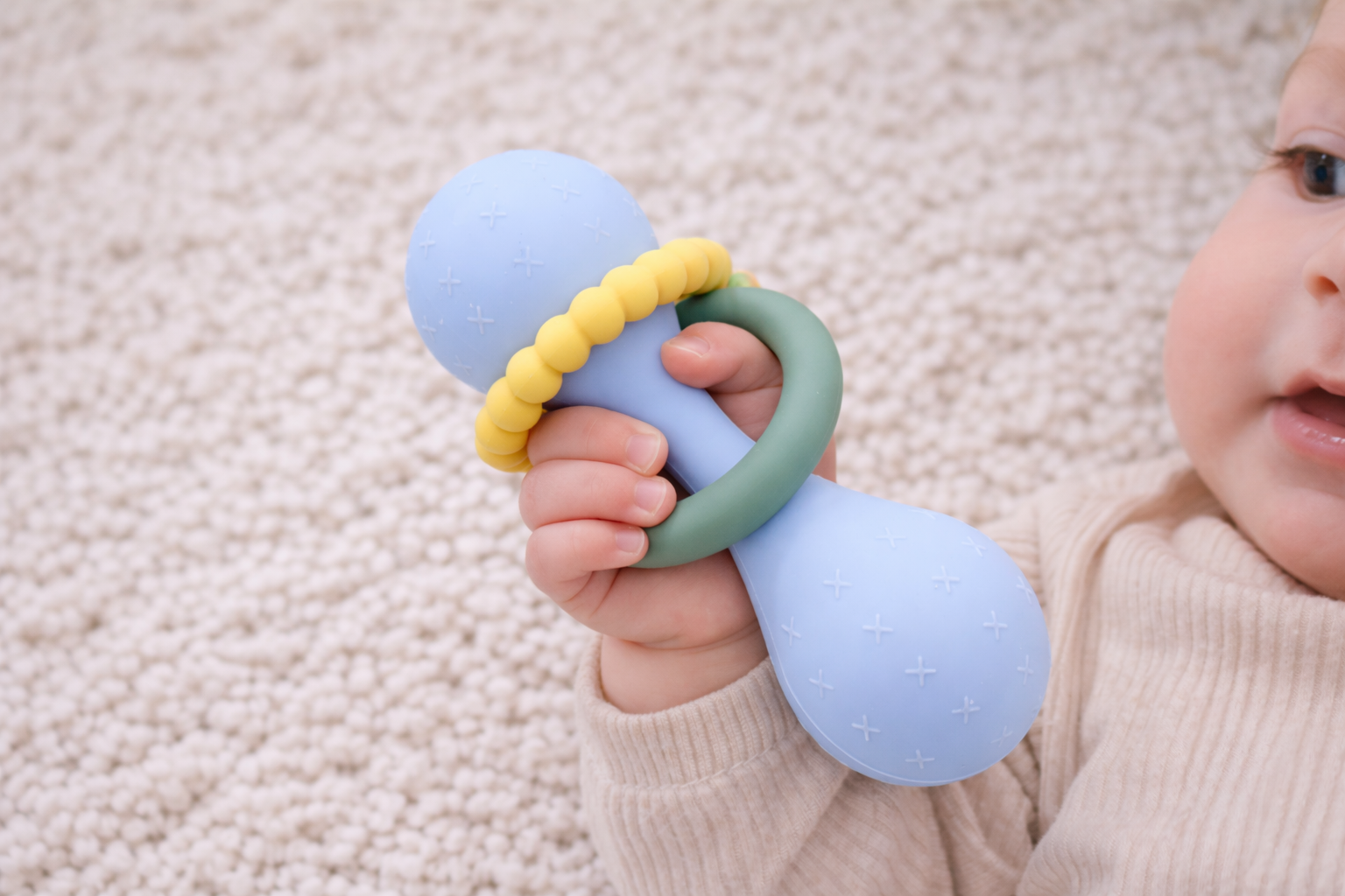 What sets this rattle apart are the two soft teething rings that surround the ends, providing multiple textures for little hands to explore and a safe surface for teething relief. The rings also make it easy for babies to grasp and hold onto, promoting fine motor skills and hand-eye coordination.
