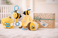 The Koala Dream Snuggle Buddy Hunny Bee Pack is a cheerful and comforting baby toy set designed to delight little ones from birth. Featuring a sweet bee theme in soft yellow, black and blue tones, this coordinated pack combines plush fabrics, playful textures and baby-friendly sensory details for cuddles, comfort and early exploration. Thoughtfully designed for babies 0+, it makes a lovely choice for newborn gifting, nursery styling and baby boutique collections. Beautifully presented in a charming gift box, this set includes four adorable bee-themed companions, each designed to engage and soothe in different ways. From soft plush textures to gentle rattles and easy-to-grasp elements, every piece encourages sensory discovery while supporting early development. Perfect for tiny hands and growing minds, this set offers a blend of comfort and play, helping to nurture fine motor skills, tactile awareness and curiosity through gentle, everyday interaction.