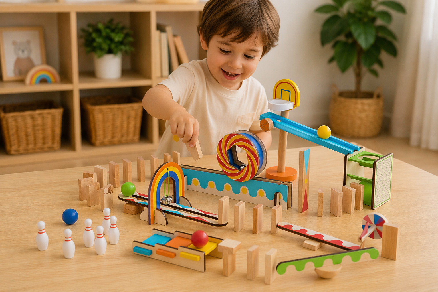Domino pieces measure 4.5cm H x 2.2cm W x 0.8cm W. Wooden marbles measure 2.5cm diameter. Basketball hoop measures 20 cm H x 6 cm W x 8 cm D.
