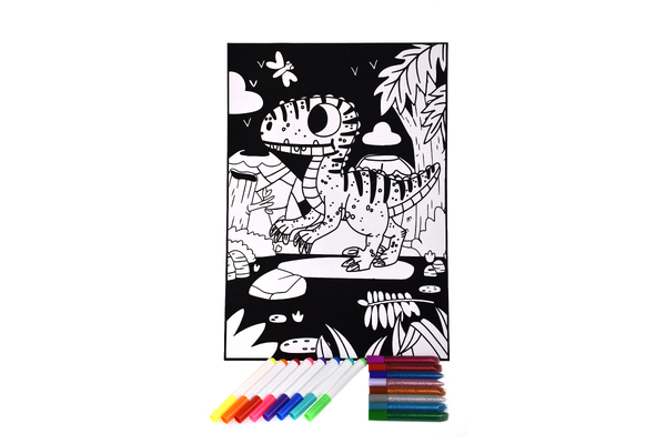 Encourage children's artistic expression with our captivating Velvet-Designed Dinosaur Art Set. A large flocked board showcases a mesmerizing dinosaur image, perfect for colouring. Included are 8 colour markers and 8 glitter glue pens to add flair and creativity. Let their imagination soar as they bring the exotic dinosaur and prehistoric scene to life. The result? A striking masterpiece, ready to adorn their bedroom walls.