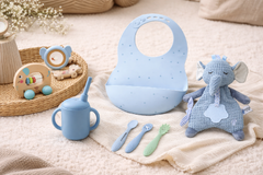 The Welcome Baby Gift Pack is a beautifully curated newborn gift set designed to celebrate baby’s arrival with a thoughtful mix of practical essentials and sweet keepsakes. Featuring a soft blue colour palette, this charming 6-piece set includes baby feeding accessories, teething-friendly items, a silicone bib, and an adorable plush elephant comfort toy for cuddles and sensory comfort. Combining usefulness, comfort and gift appeal, this coordinated pack is ideal for baby showers, newborn gifting and special first moments. A lovely all-in-one gift set for welcoming a precious new baby.