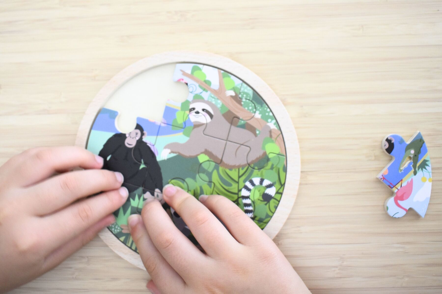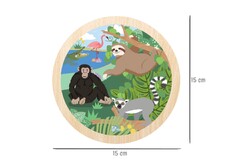 Invite little learners into a calm and colourful rainforest scene with the Wild Buddies 9 Piece Round Jigsaw Puzzle Hanging Around from Koala Dream. Children will enjoy discovering the friendly sloth hanging from a branch, the curious lemur perched nearby and the playful monkey on the forest floor. In the background, a crocodile glides through the river while a bright pink flamingo adds a cheerful pop of colour.