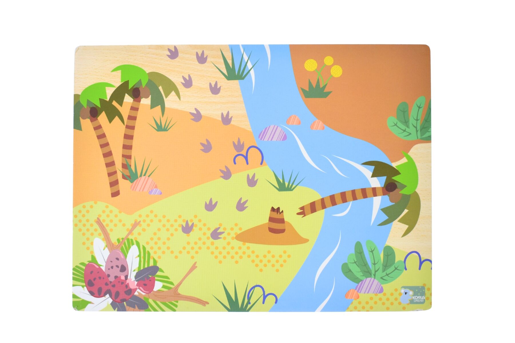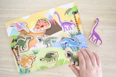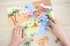 Underneath each dinosaur, children will discover the printed name of the species, helping to support early word recognition and introduce fun dino facts. Once the puzzle is complete, flip the board over to reveal a vibrant prehistoric play scene where kids can act out dinosaur adventures and create their own Jurassic world