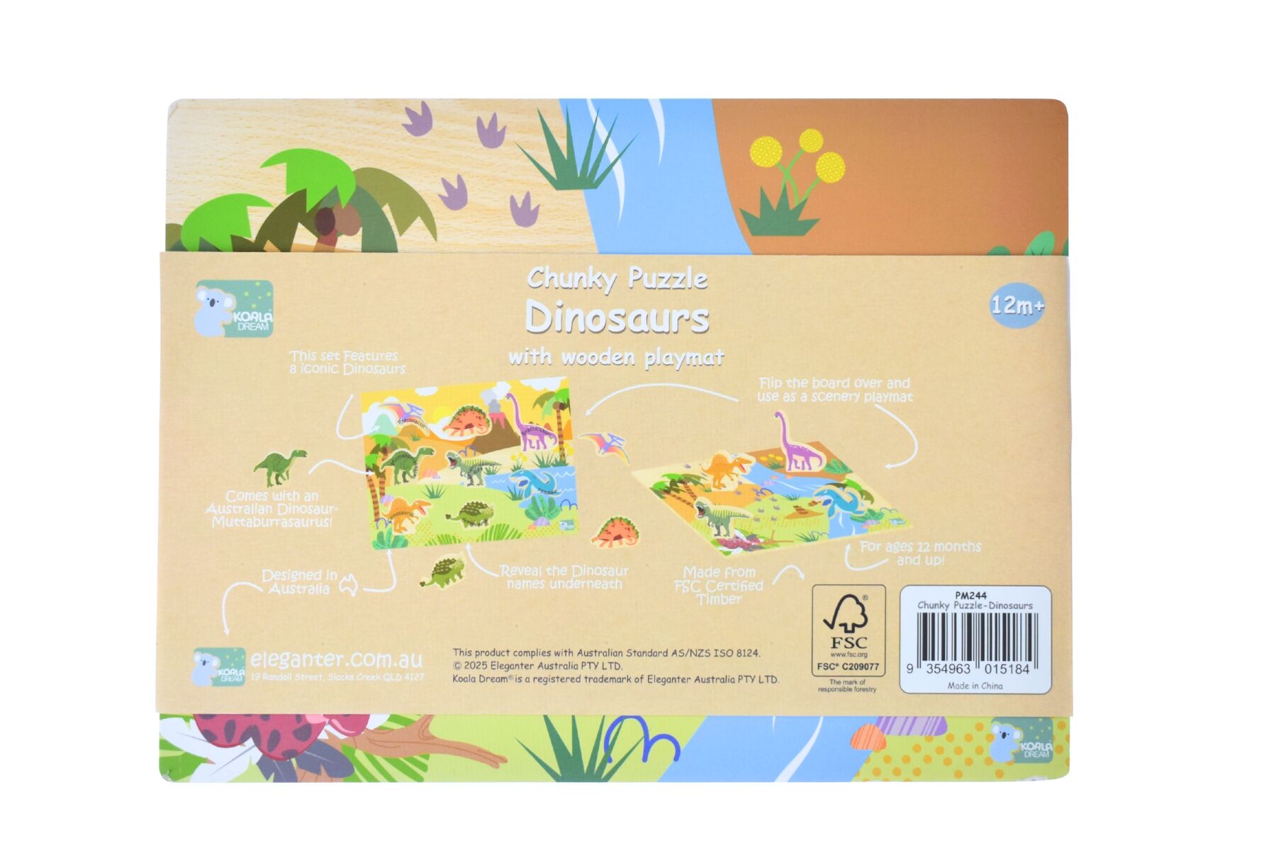 Roar into prehistoric fun with the Koala Dream Wooden Chunky Dinosaur Puzzle. This engaging 2-in-1 puzzle features seven chunky wooden dinosaurs, including favourites like Tyrannosaurus Rex, Spinosaurus, and Mosasaur. Designed for little hands, each piece is thick, easy to grasp, and can stand upright for imaginative play beyond the puzzle board.
