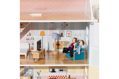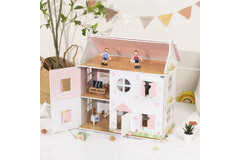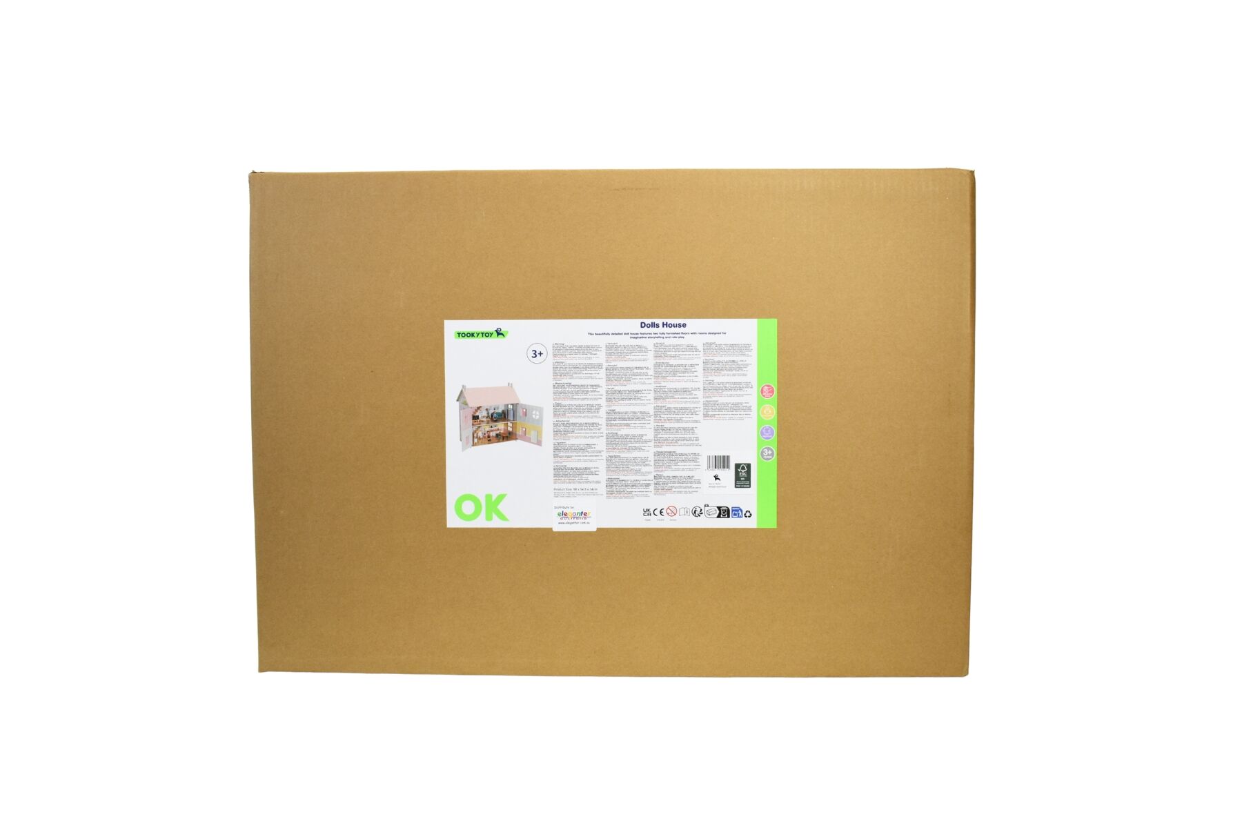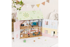 Create endless imaginative play with the Wooden Doll House from Tooky Toy. Beautifully crafted from FSC-certified timber, this charming two-storey house slots together easily without the need for any screws—perfect for quick, frustration-free assembly. The modern-style furniture pieces and two included dolls are made from a high-quality blend of wood and durable plastic components, offering both strength and lovely detail. The house features colourful illustrated rooms that bring each space to life, inspiring storytelling, role play, and creative exploration. A delightful added feature is the removable roof panels. These can be placed in front of or behind the dolls house and flipped over to reveal a sweet garden scene printed on the underside—soft pinks and greens that extend the play environment even further. The set includes essential furniture such as beds, a sofa, a dining table, kitchen units and bathroom fixtures, encouraging children to create their own stories and explore everyday life through play. Designed with smooth edges and non-toxic finishes, it ensures safe, durable, long-lasting fun. Perfect for developing social skills, fine motor coordination and imagination, the Wooden Doll House from Tooky Toy is an engaging play experience that children will return to again and again—a beautiful and lasting addition to any playroom.