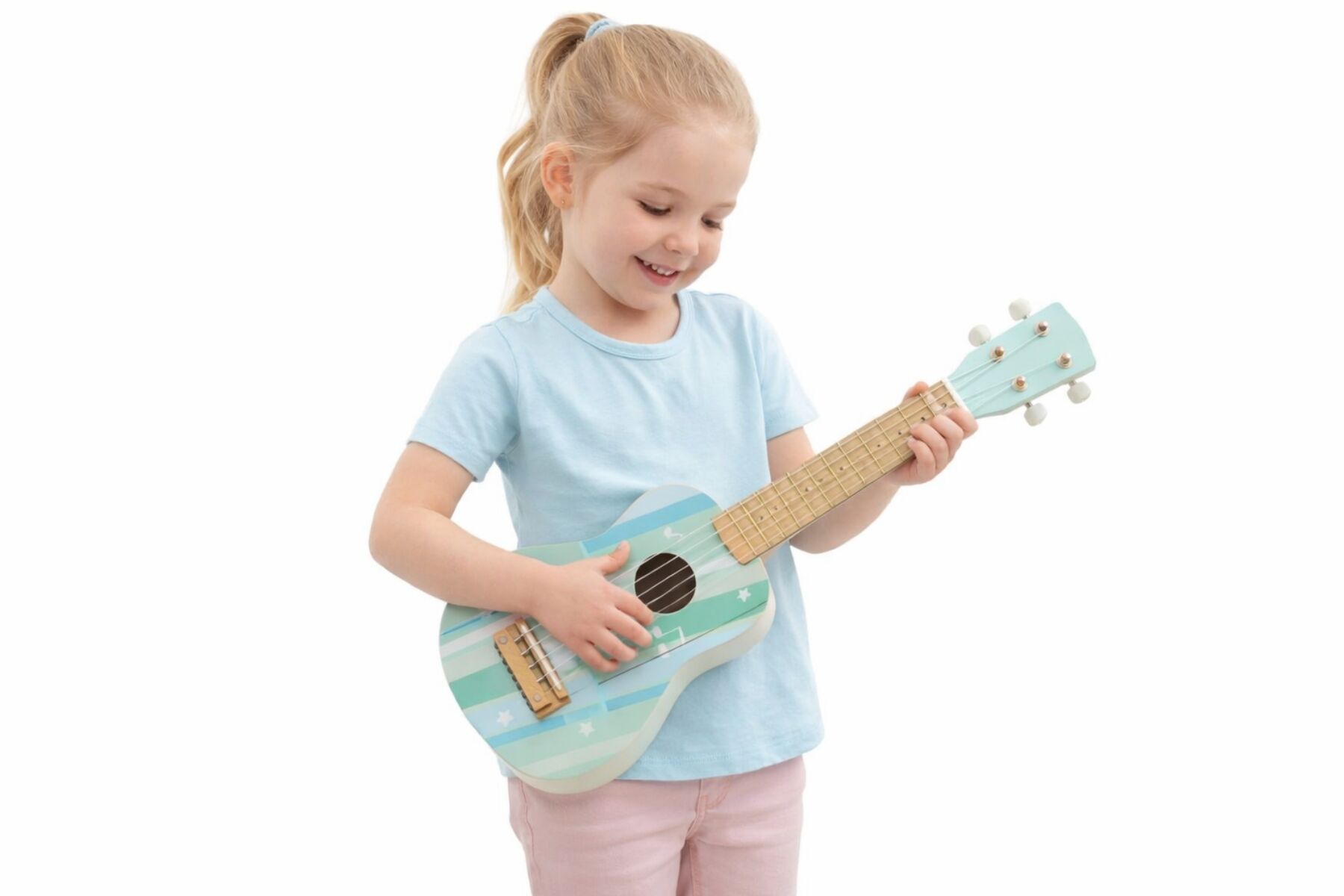 This lovely wooden guitar in Misty Aqua colours is the perfect instrument for young children who want to explore music and playing. compact in size, this guitar is a cross between a guitar and a ukulele in size, so perfect for little hands. Kids will enjoy having a jam on the chords, and as this is acoustic, ears will also enjoy the sounds this guitar makes. Play together or with friends, this compact guitar is the perfect companion for any budding musician. Each wooden Guitar from Calm and Breezy by Kaper Kidz is made from timber and finished to the highest quality and painted in child safe, non toxic paint.