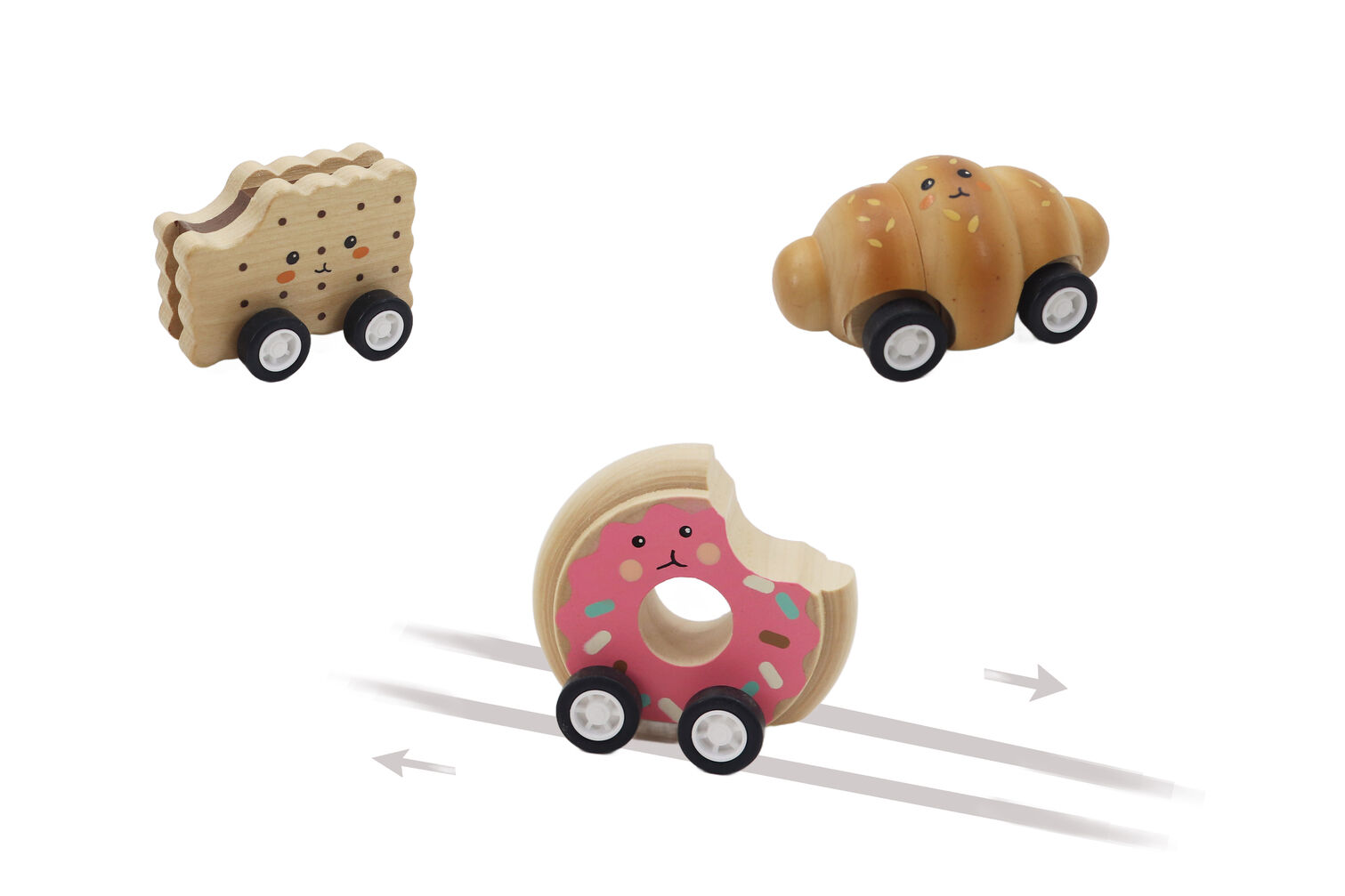 Make playtime extra sweet with the Wooden Pull Back Pastries Set of 3 by Kaper Kidz. This adorable wooden toy set features three cute food characters including a donut, a croissant and a smore, each mounted on smooth rolling wheels. Simply pull the pastry back and watch it zoom across the floor, delighting young children while introducing movement and cause and effect play.