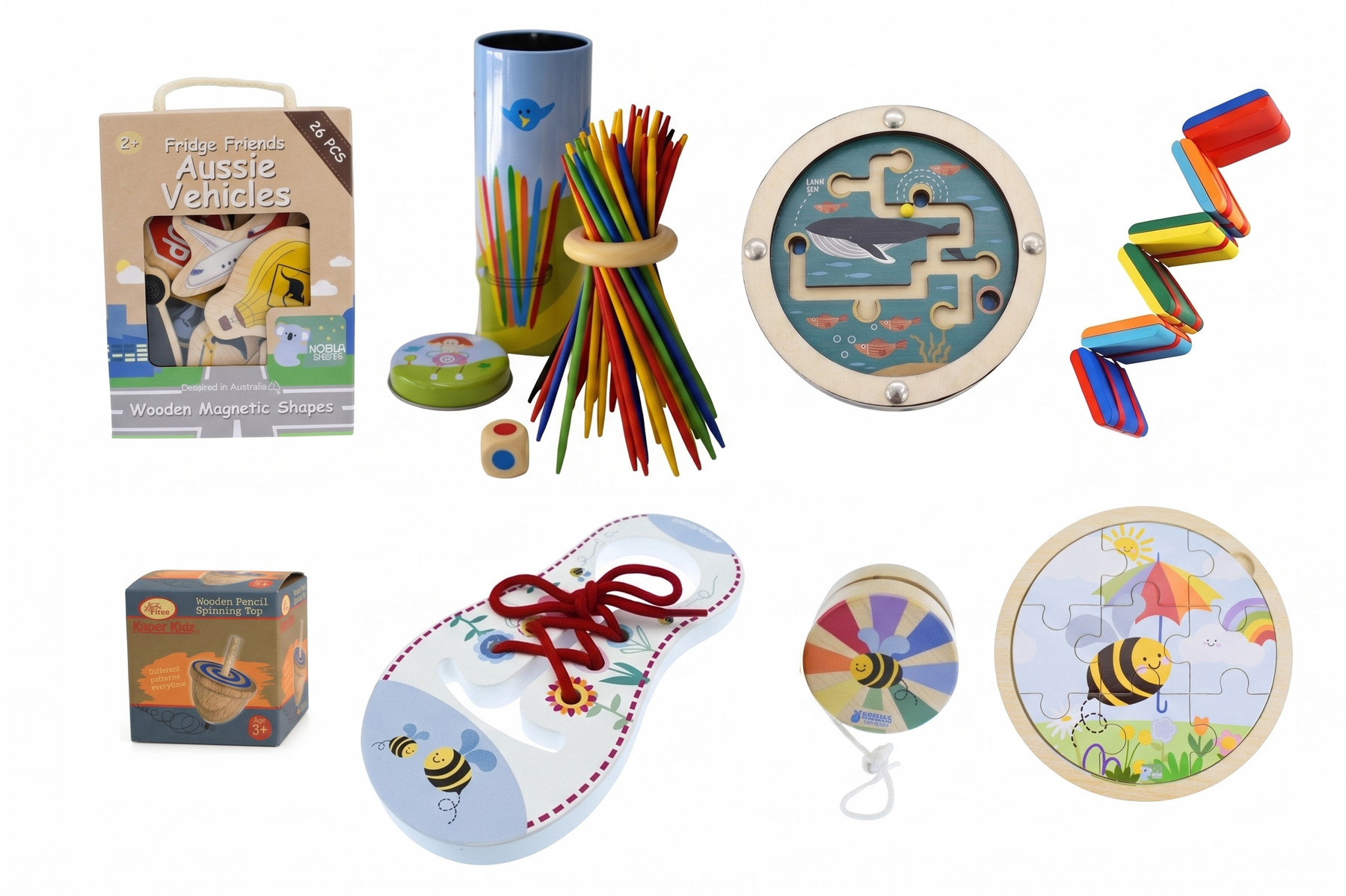 Aussie Vehicles Magnetic Shapes: 26 magnetic wooden pieces featuring iconic Australian emergency and service vehicles. Perfect for imaginative play on a fridge or magnet board. (Ages 2+)