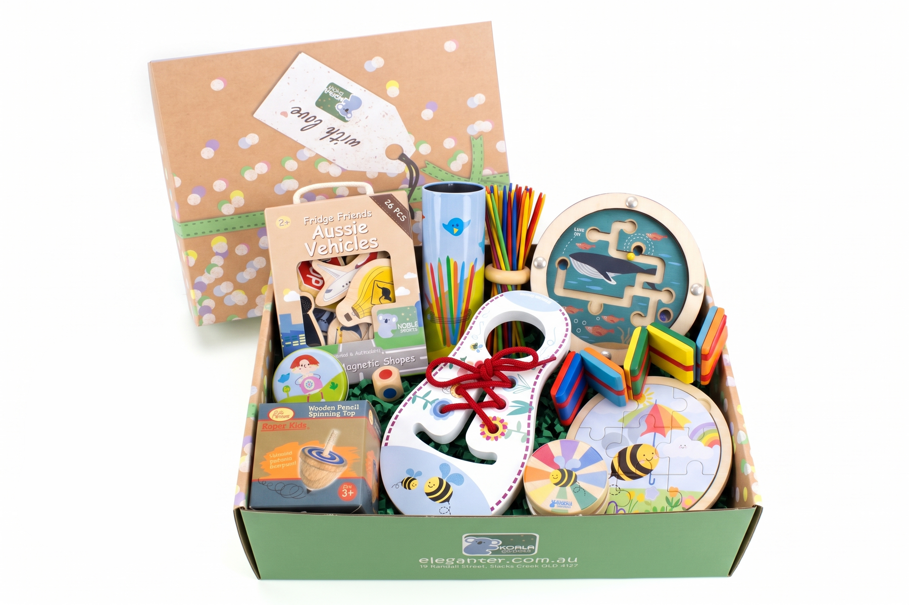 Ignite imagination and foster essential early development with this meticulously curated Wooden Toy Playtime Gift Set. Housed in a charming, reusable gift box featuring a koala motif and a thoughtful "with love" tag, this collection is designed to delight and educate children aged 3 and above.